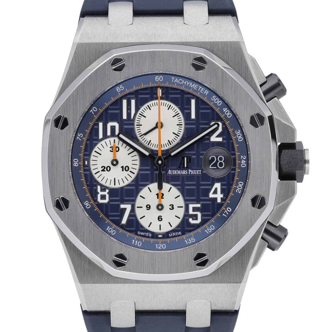 Powered by the Audemars Piguet Calibre 3126/3840 automatic movement, this reference offers dependable chronograph functionality and strong precision, visible through its solid case construction built for performance. The pushers and crown guards enhance durability, while the integrated rubber strap ensures secure, comfortable wrist wear.