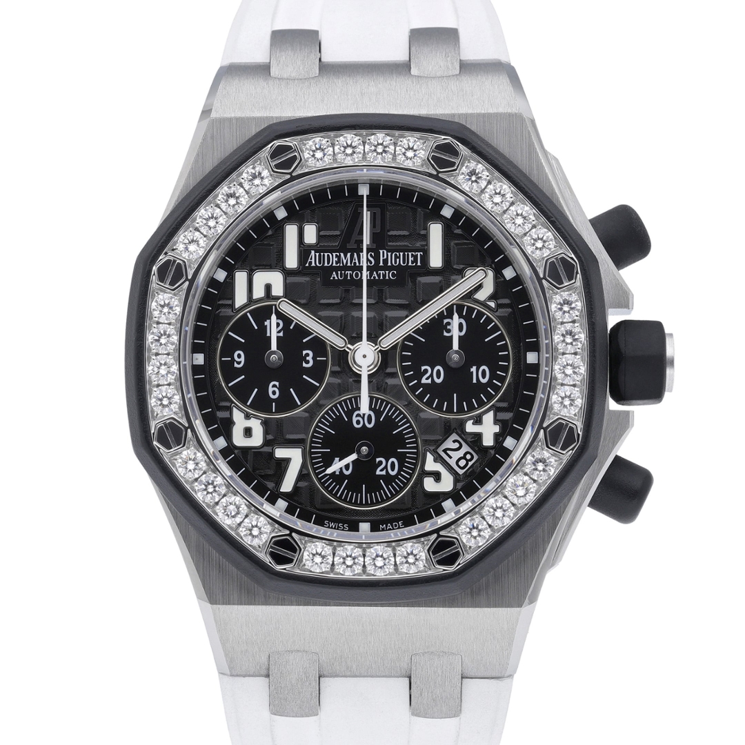An Audemars Piguet Royal Oak Offshore watch, model 26470IO.OO.A006CA.01, presented on a white rubber strap with a stainless steel case and clasp. The bold 42mm Offshore case retains the collection’s unmistakable octagonal profile, enhanced here by a striking diamond-set bezel that adds an elevated level of luxury to the robust sports design. The black “Méga Tapisserie” dial features luminous Arabic numerals, three chronograph sub-dials, and a date aperture at 4-5 o’clock, creating a balanced yet highly legible layout.