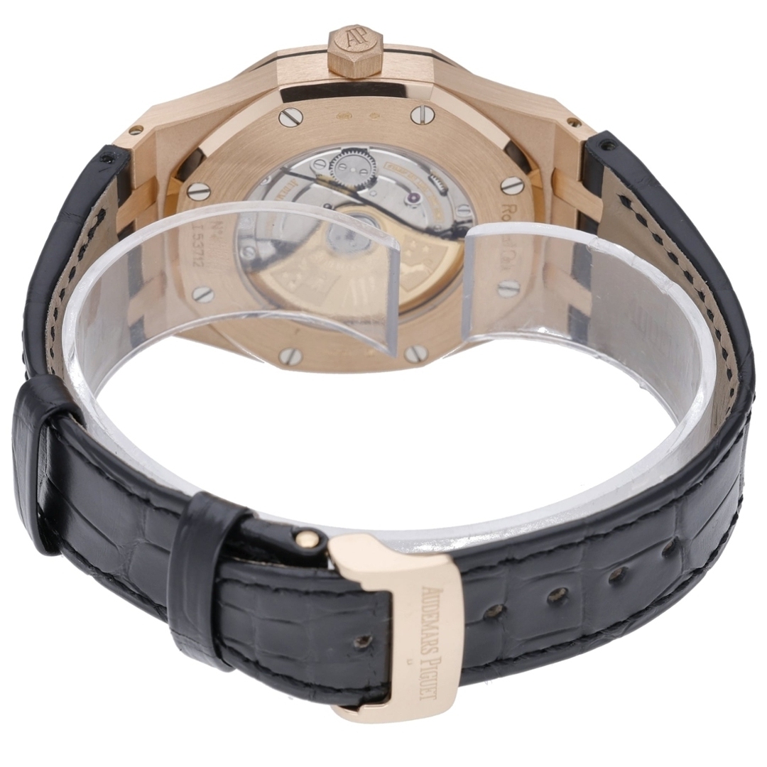 An Audemars Piguet Royal Oak Selfwinding is a highly desirable 41mm reference crafted in solid 18ct rose gold, paired with a black leather strap for a more understated and contemporary presentation. The iconic octagonal bezel with exposed screws frames the signature black “Grande Tapisserie” dial, finished with applied rose gold baton hour markers and matching hands, delivering strong contrast and unmistakable Royal Oak character.
