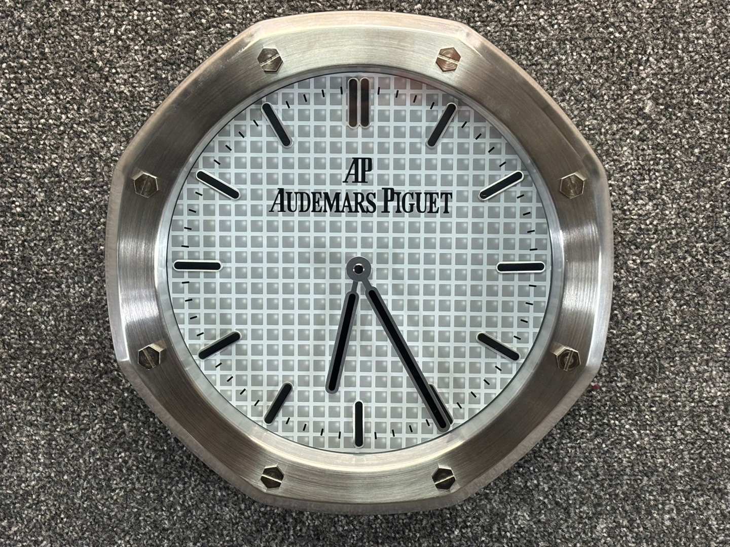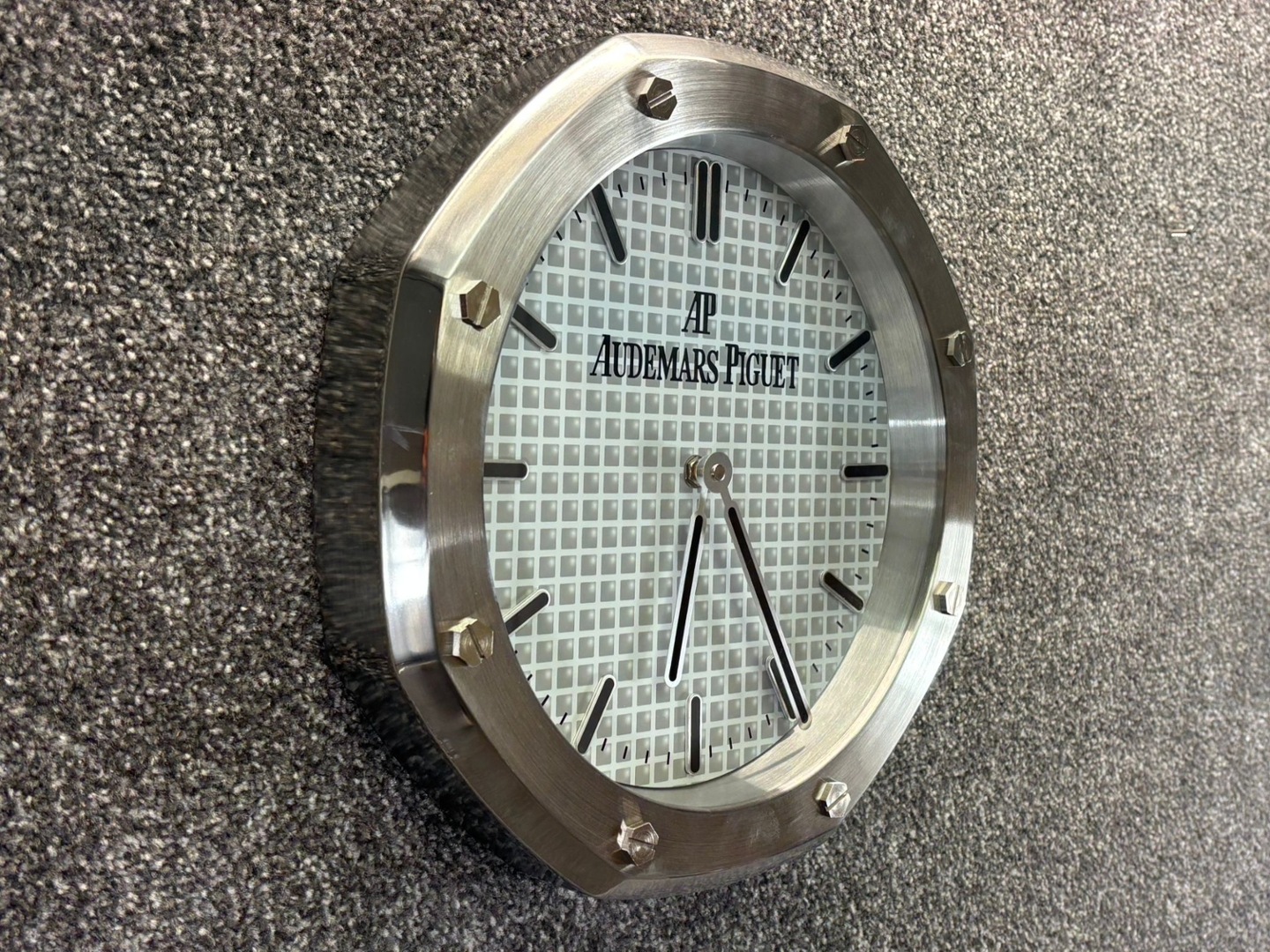 A stainless steel replica Audemars Piguet wall clock designed in the instantly recognisable Royal Oak style, this piece brings the prestige of high horology into a bold decorative format. The octagonal bezel, featuring exposed screw detailing, mirrors the iconic design codes of Audemars Piguet. The silver-toned case and refined white grid-pattern dial capture the luxurious appeal of the brand. The prominent AP logo and clean baton hour markers ensure the dial is instantly striking, making it a sophisticated statement for any wall.