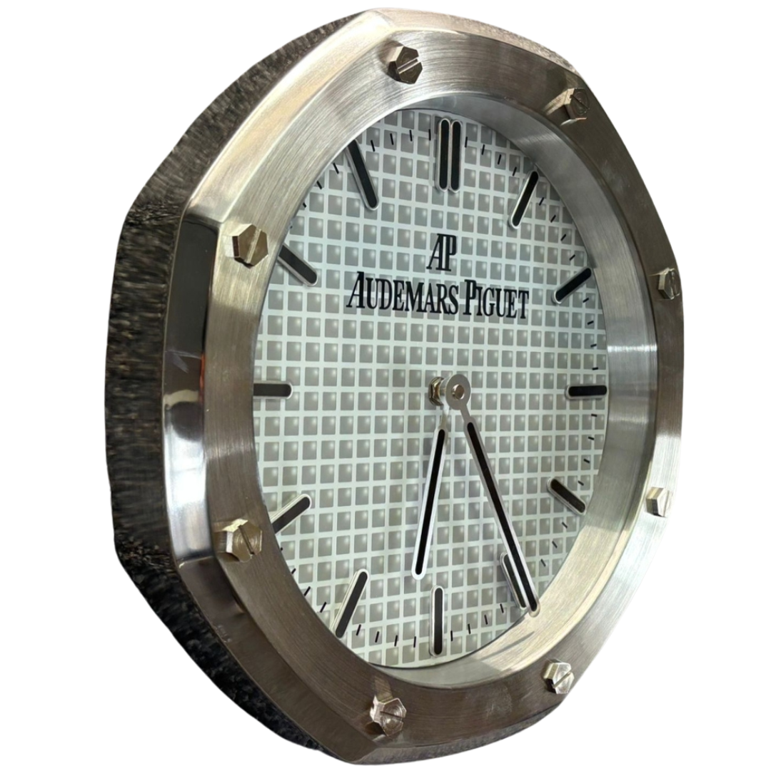 A stainless steel replica Audemars Piguet wall clock designed in the instantly recognisable Royal Oak style, this piece brings the prestige of high horology into a bold decorative format. The octagonal bezel, featuring exposed screw detailing, mirrors the iconic design codes of Audemars Piguet. The silver-toned case and refined white grid-pattern dial capture the luxurious appeal of the brand. The prominent AP logo and clean baton hour markers ensure the dial is instantly striking, making it a sophisticated statement for any wall.