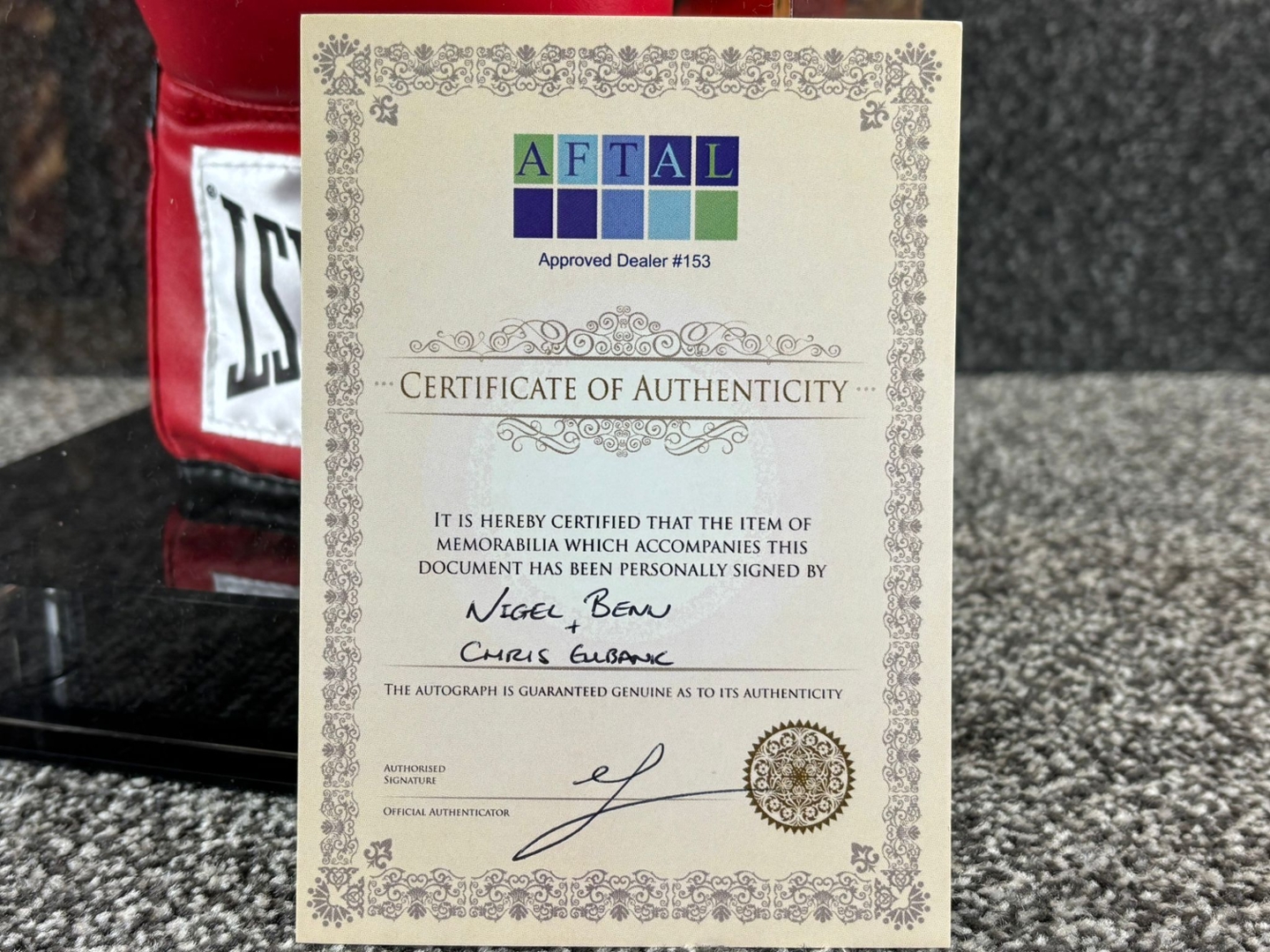 A signed and authenticated red Everlast boxing glove bearing the autographs of Nigel Benn and Chris Eubank, two of the most iconic figures in British boxing history. Their legendary rivalry captivated audiences throughout the 1990s, and this glove captures the intensity, prestige, and lasting legacy of those unforgettable encounters inside the ring.