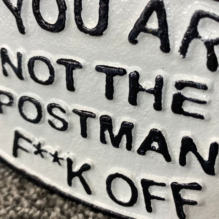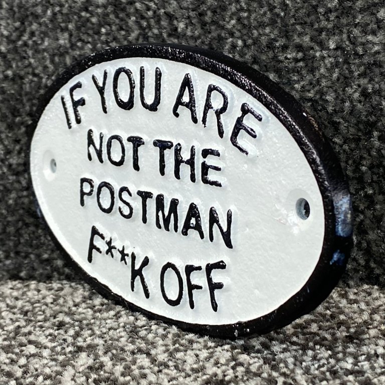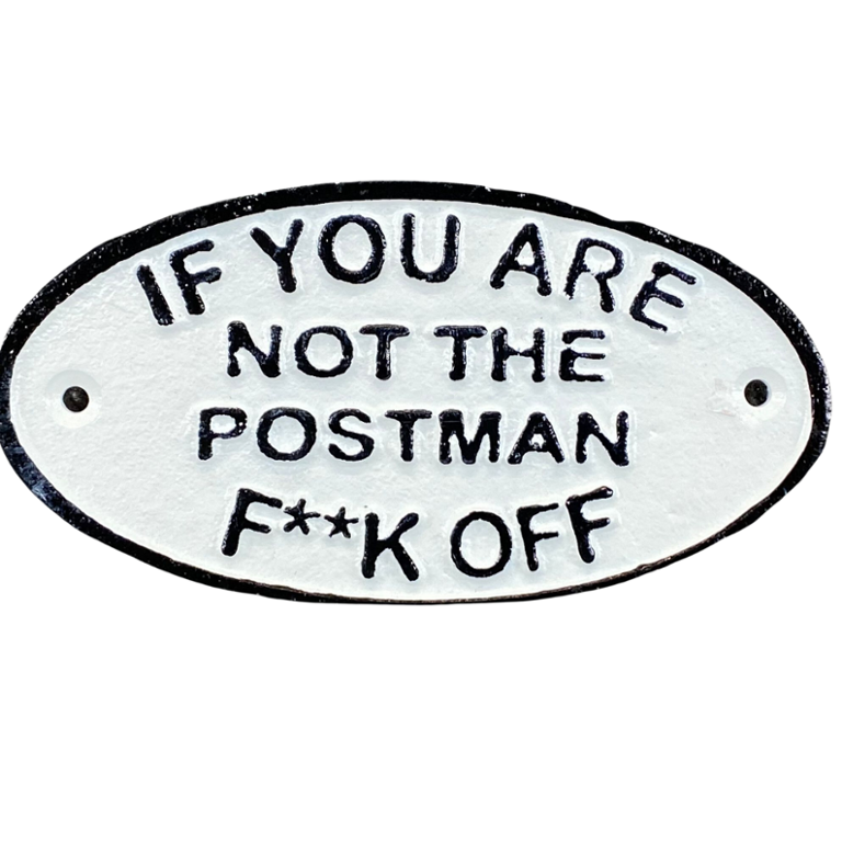 A black & white cast iron wall sign with the humorous inscription “If You Are Not the Postman F**k Off” is the perfect statement piece for those who appreciate bold and cheeky décor. Designed in a classic oval shape, the black raised lettering stands out sharply against the white background, ensuring the message is immediately noticeable. Its rustic cast iron construction gives it a sturdy and traditional look, while the playful wording guarantees plenty of laughs.