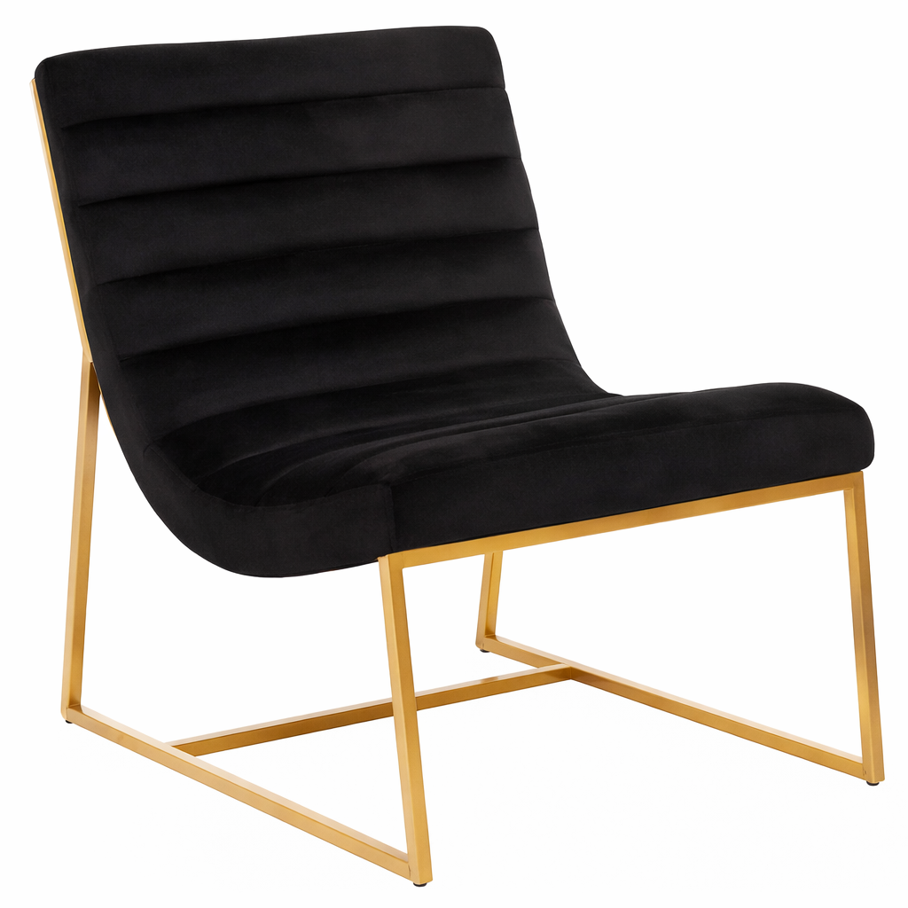 A black velvet Art-Deco design lounge chair that exudes bold sophistication and timeless glamour. Upholstered in deep black velvet, this striking piece features a gently reclined backrest with horizontal channel detailing, enhancing its classic Art-Deco influence. The sleek, curved seat and supportive back create a refined silhouette that blends vintage inspiration with contemporary styling, making it a standout addition to any modern interior.