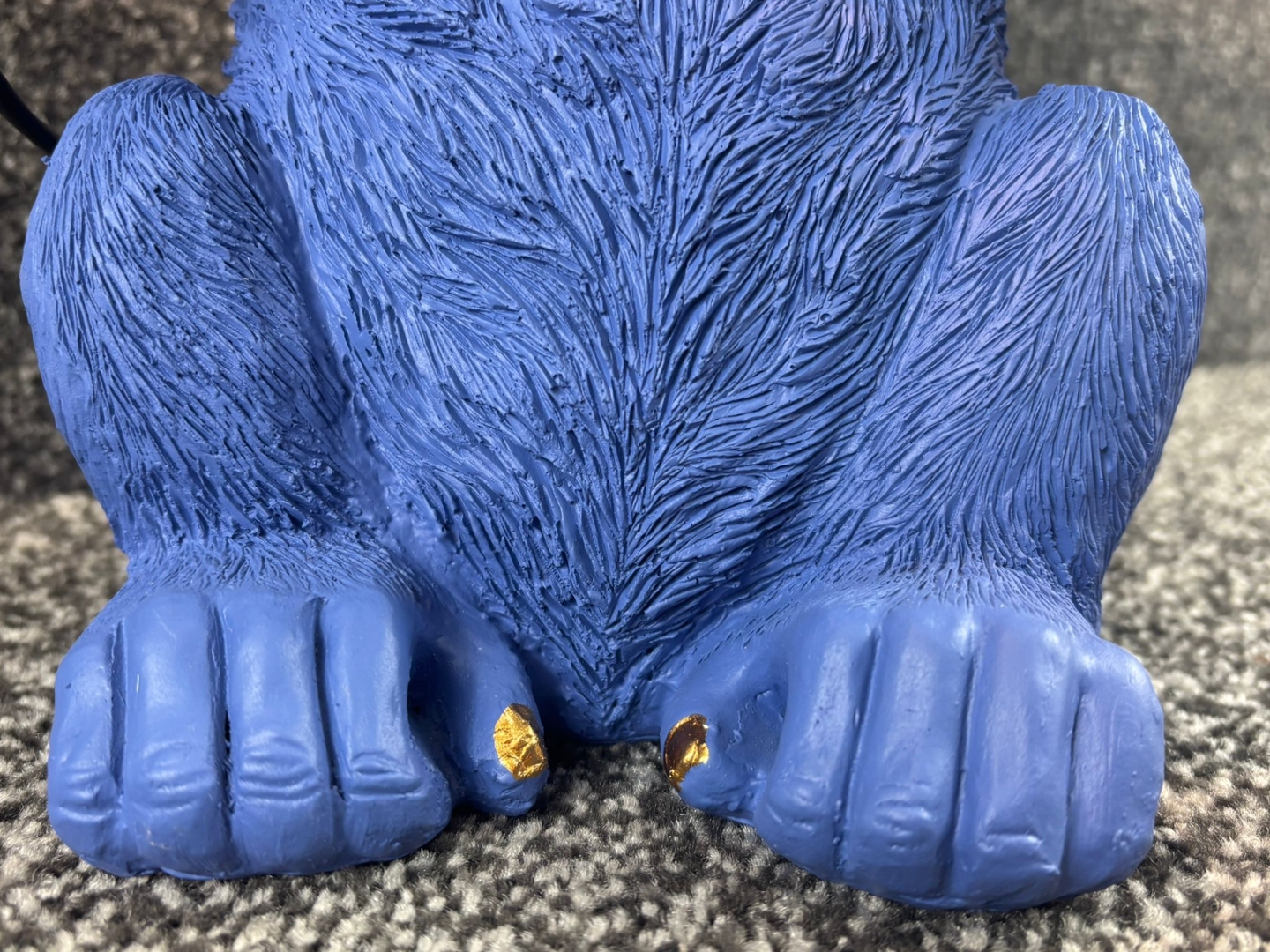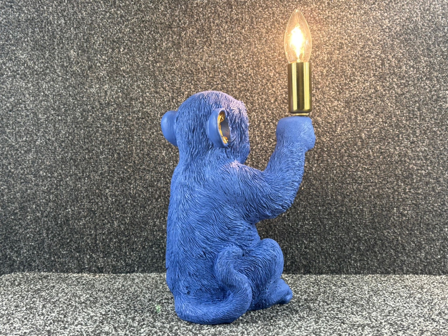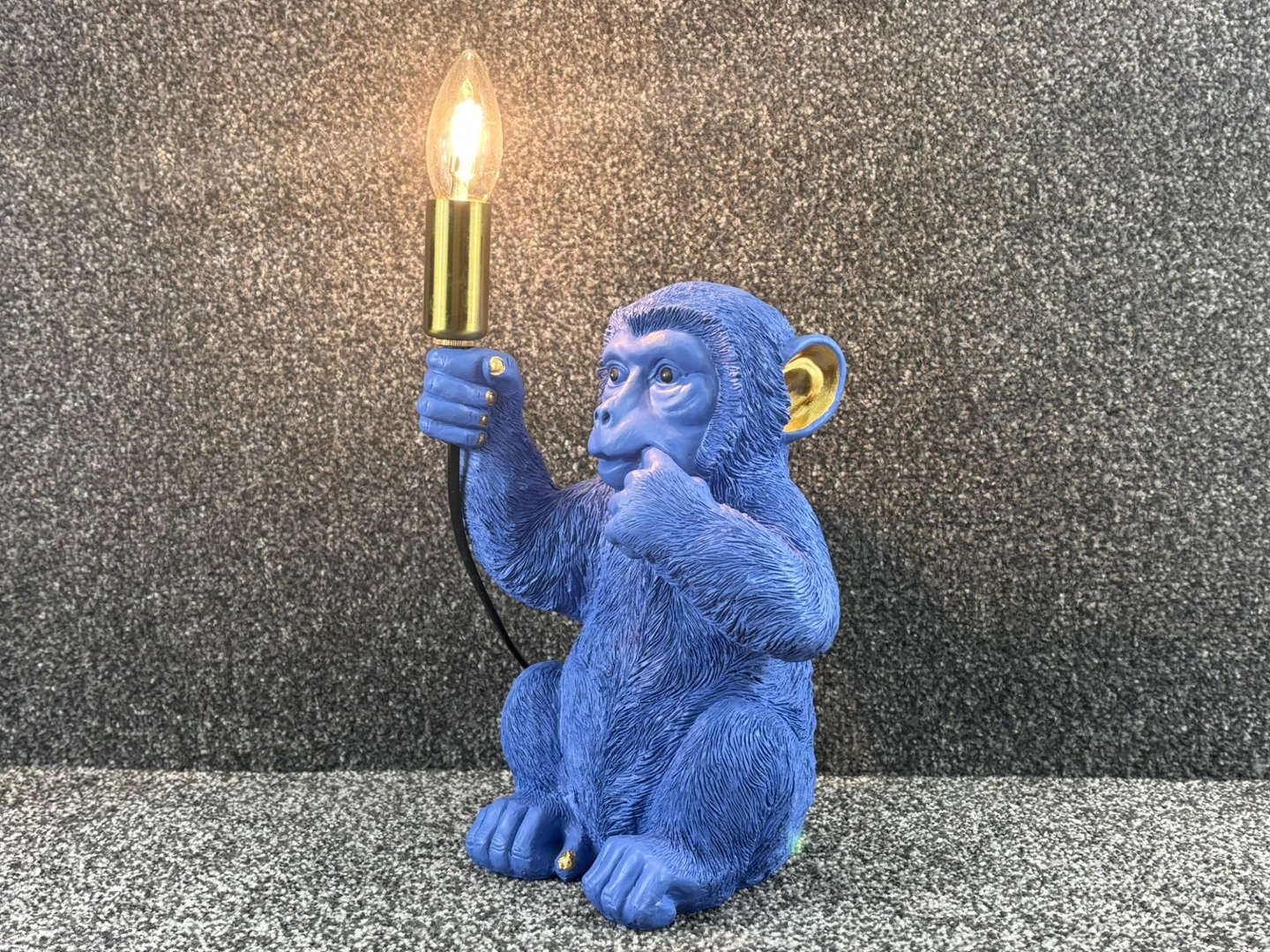 A blue sitting chimp table lamp that combines playful character with functional design. Crafted with attention to detail, the lamp features a seated chimp holding a brass-toned fitting with an exposed bulb, creating a striking and whimsical look. The textured surface captures the fur and features of the chimp, while the bold blue finish adds a modern and artistic twist. This unique piece is designed not just to illuminate but also to serve as a conversation starter in any setting.