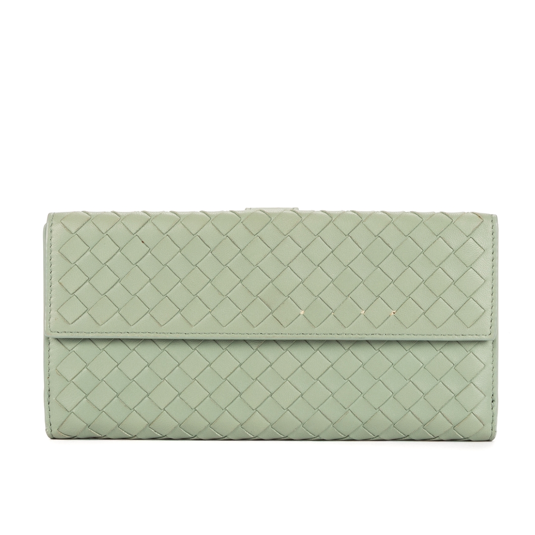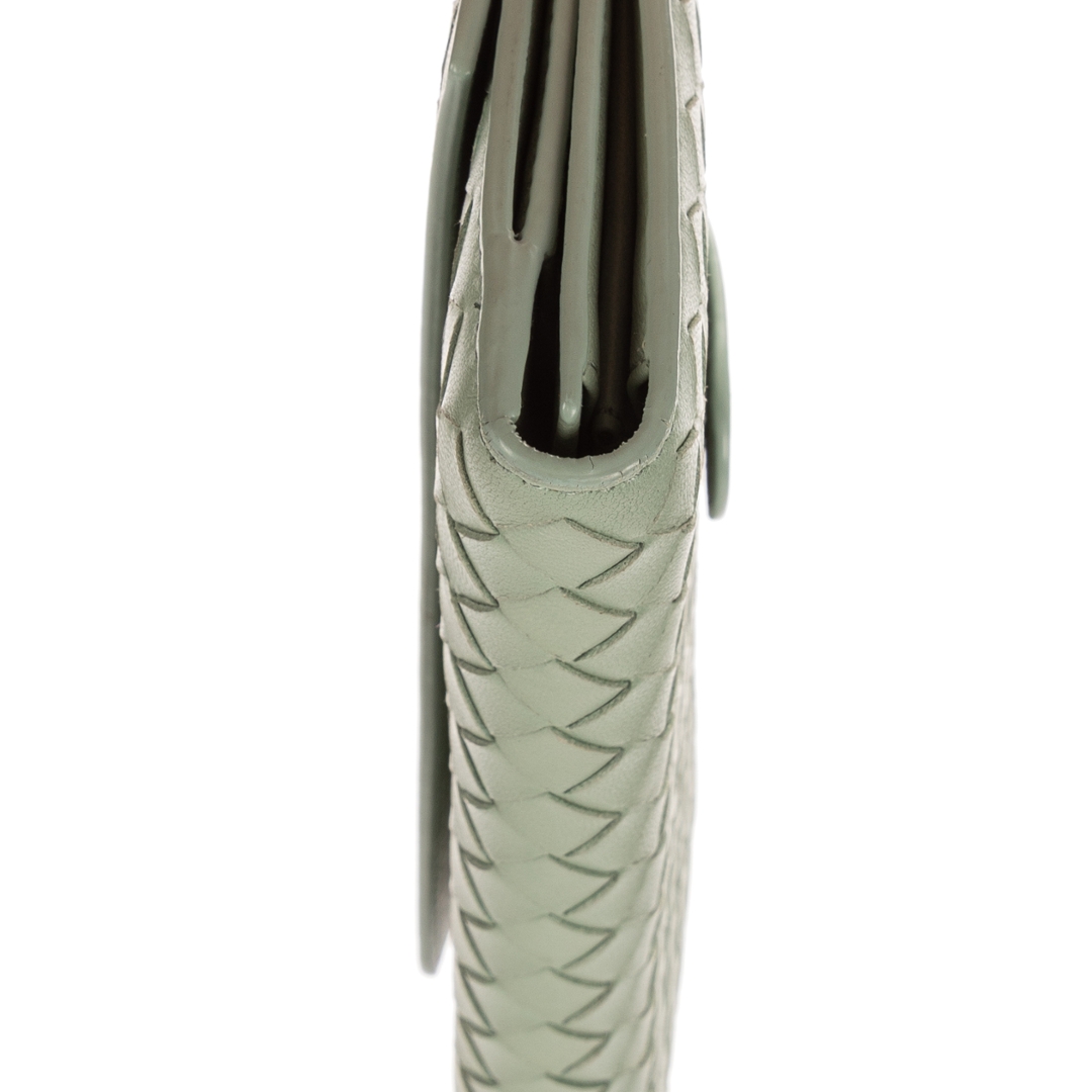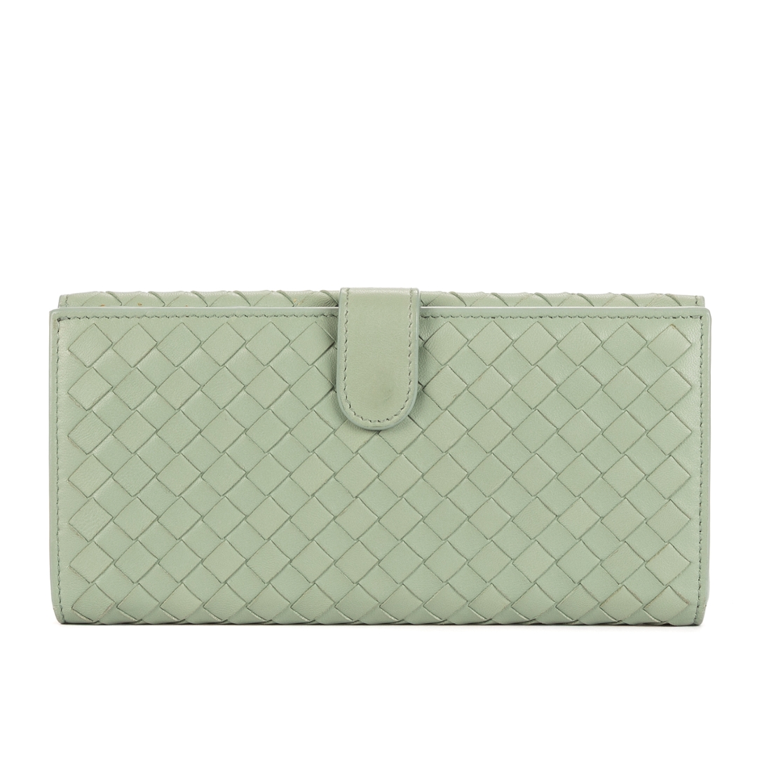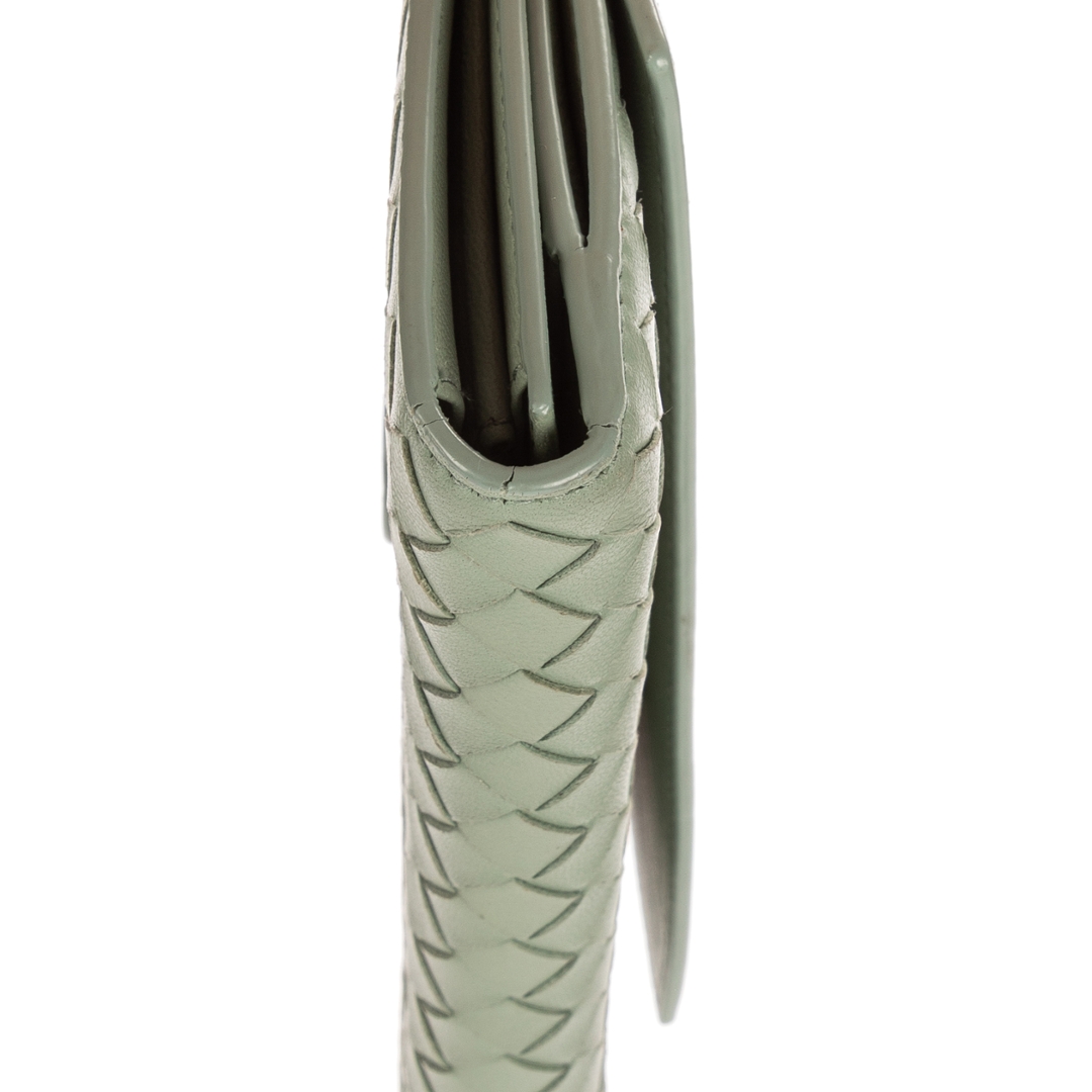 A vintage Bottega Veneta light green calf leather Intrecciato Long Wallet with a certificate of authenticity, Approximately 9cm height, 19cm width.