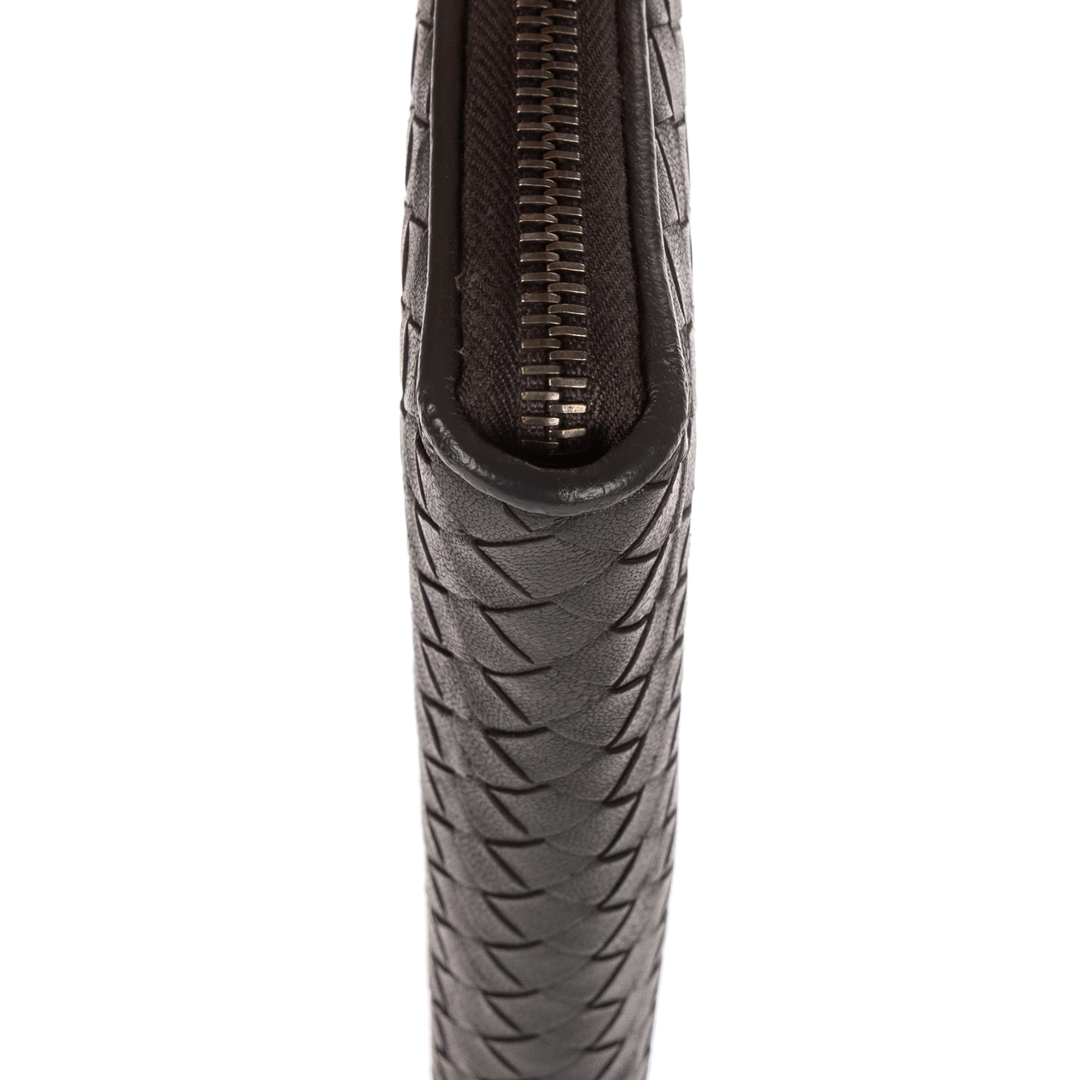 A vintage Bottega Veneta dark grey calf leather Intrecciato Zip Around Wallet with a certificate of authenticity, Approximately 11cm height, 21cm width.