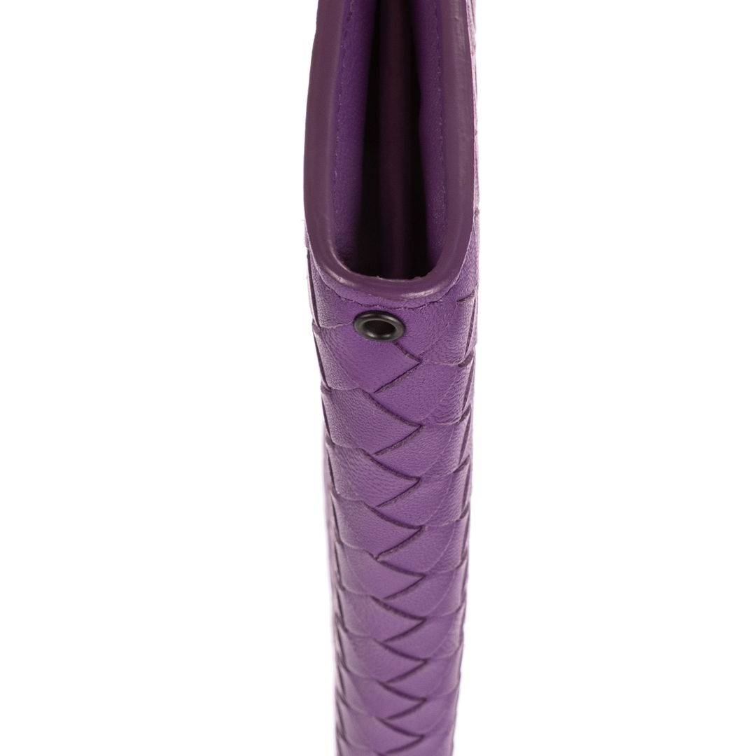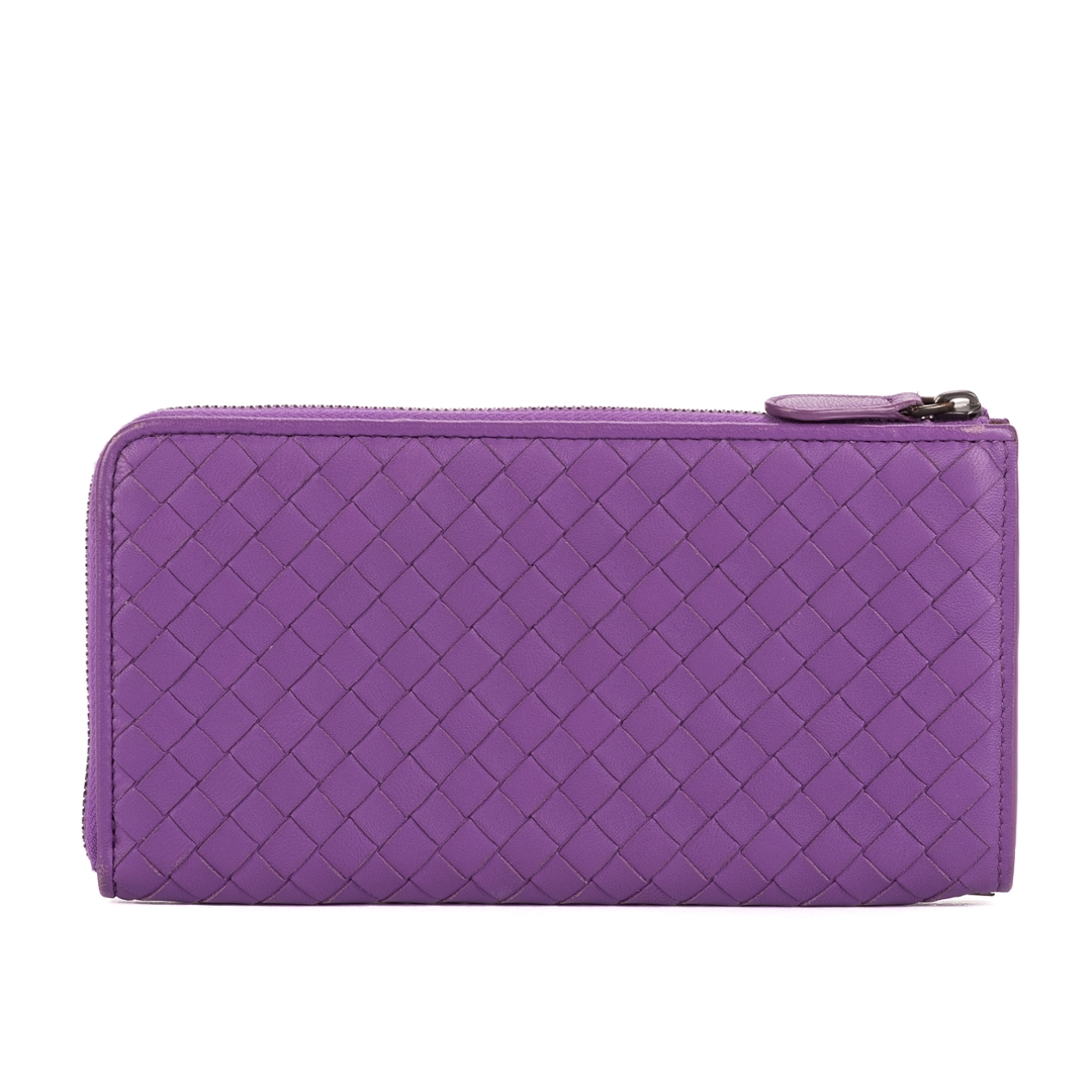 A vintage Bottega Veneta purple calf leather Intrecciato Zip Wallet with a certificate of authenticity, Approximately 10cm height, 19cm width.