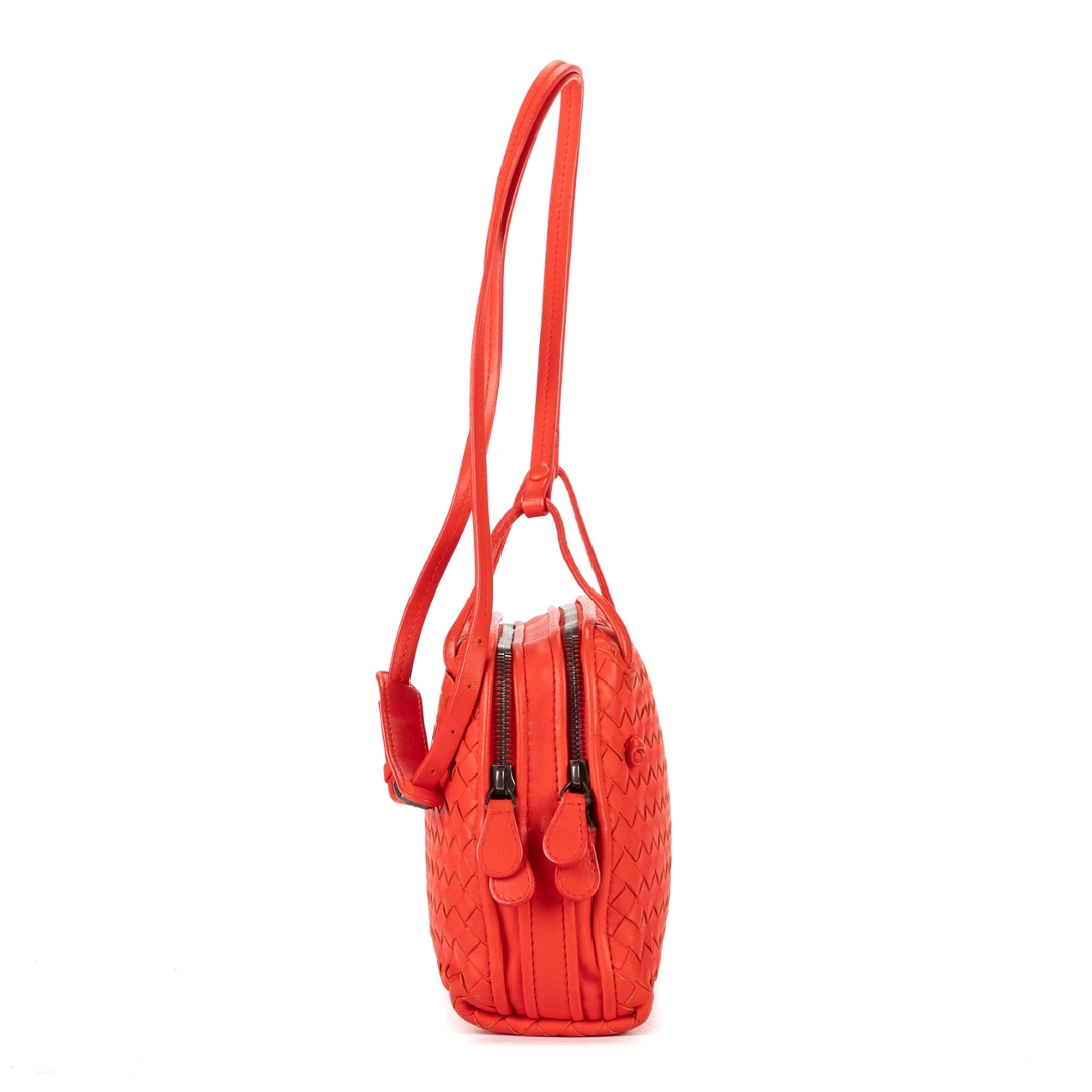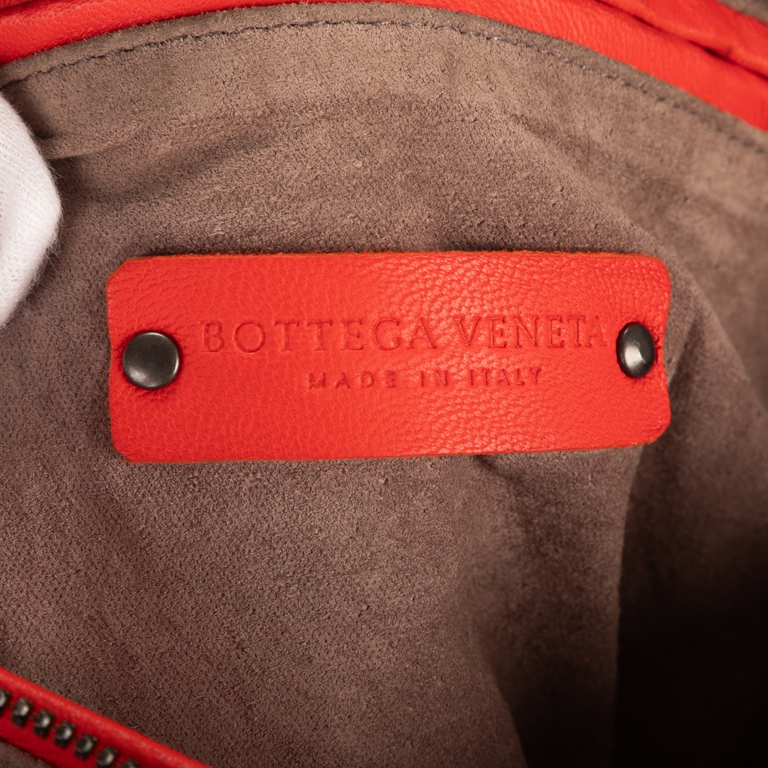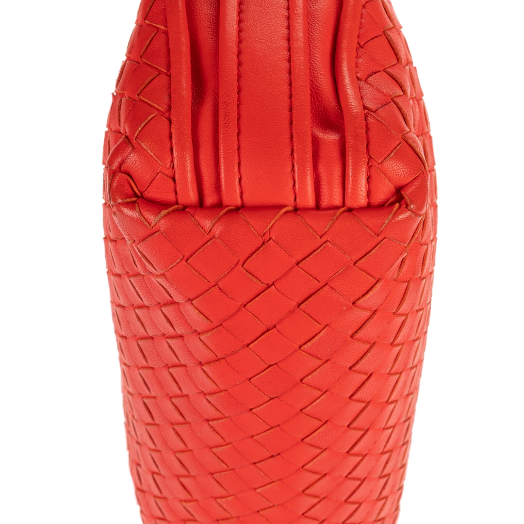 A vintage Bottega Veneta red calf leather Nodini Double Zipper bag with a certificate of authenticity, Approximately 19cm height, 22cm width.