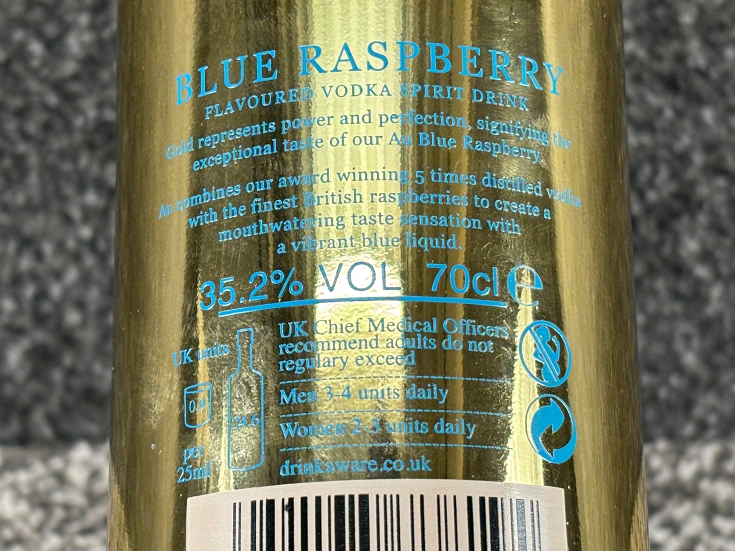 A 70cl bottle of AU Vodka Blue Raspberry stands out with its