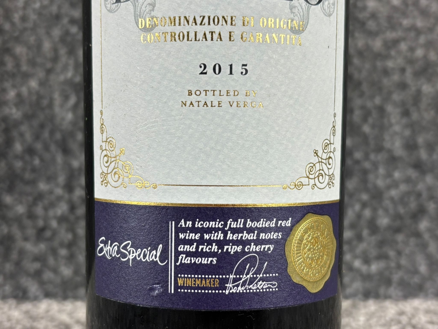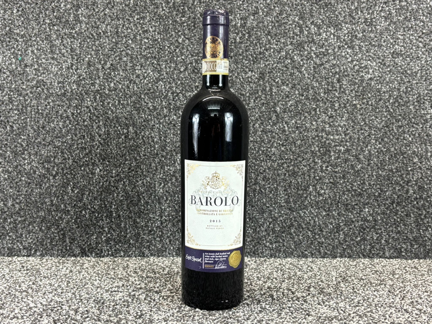 A 75cl bottle of 2015 Barolo Red Wine presents a classic, distinguished appearance with its deep, dark glass and elegant cream label. The ornate crest, fine detailing, and DOCG seal reinforce its authenticity and premium status, while the vintage year is proudly displayed. It’s a bottle that immediately signals heritage, craftsmanship, and Italian winemaking tradition at its finest.