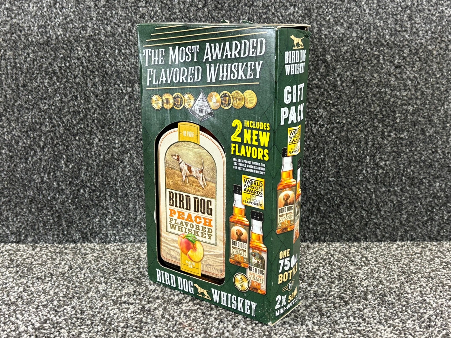 A bottle of Bird Dog Peach Flavoured Whiskey with 2. Miniatures. 750ml.