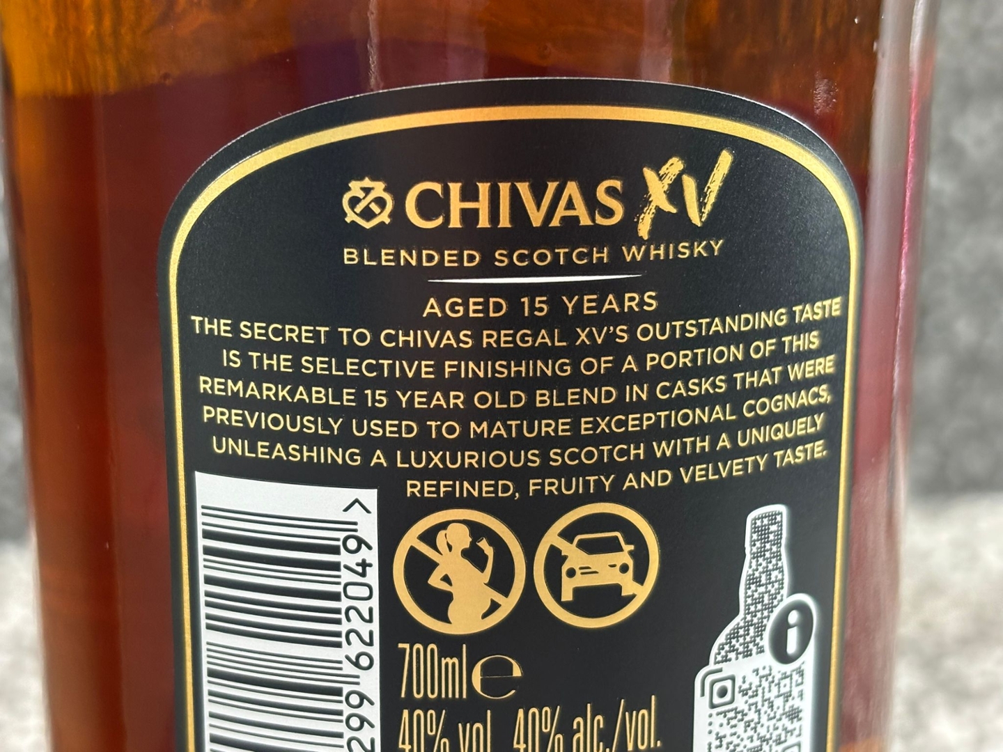 A bottle of Chivas Regal 15 Year Old Blended Scotch Whisky, presented in its distinctive gold presentation box, celebrating refinement and modern Scottish blending. This 70cl release showcases Chivas Regal’s signature elegance, elevated by a selective finishing period in cognac casks, which adds an extra layer of depth and character. The packaging and bottle design reflect the premium positioning of this well-regarded expression.