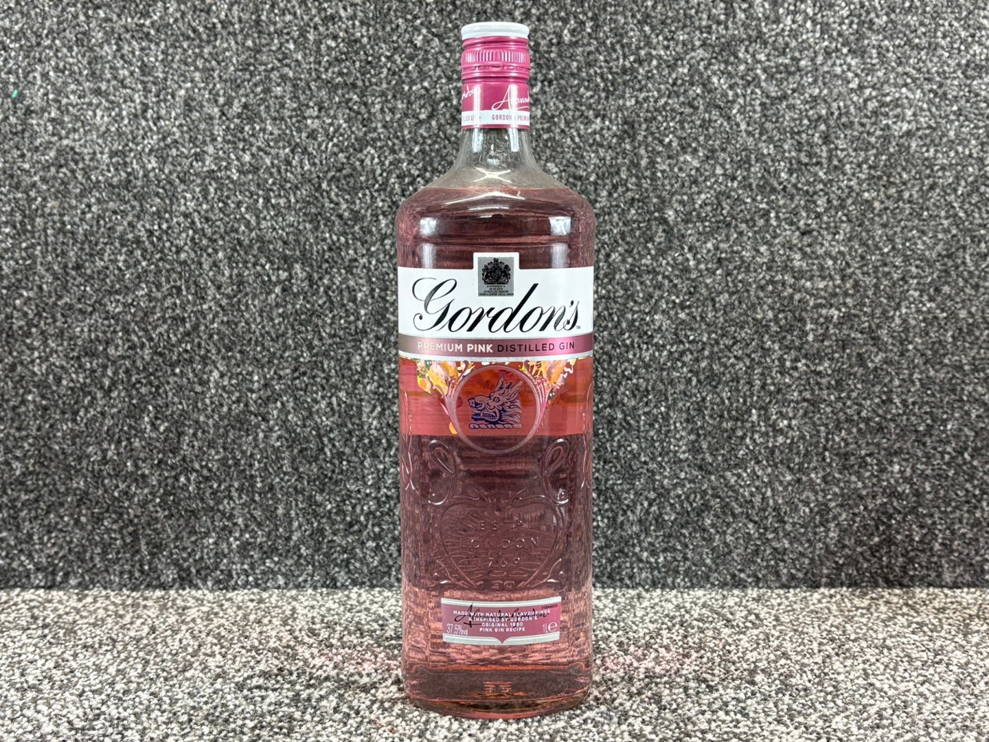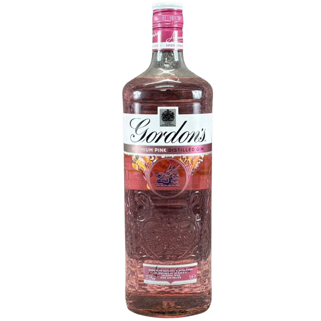 A bottle of Gordon's Premium Pink Distilled Gin. 1 litre.