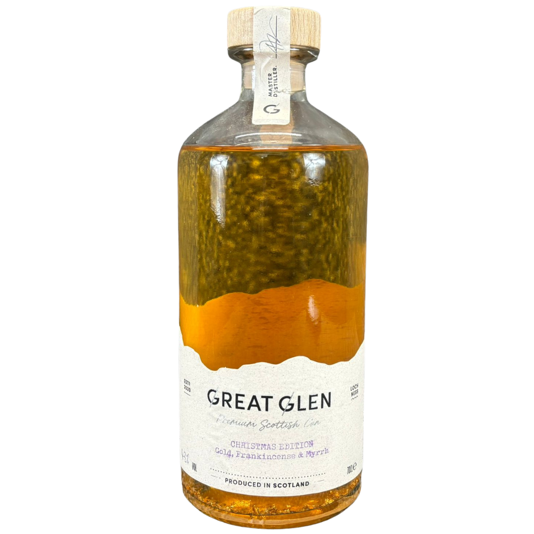A 70cl bottle of Great Glen Premium Scottish Gin, shown exactly as pictured with its warm amber-gold hue and natural-style wooden stopper. The label clearly identifies this as the Christmas Edition, featuring festive botanicals such as frankincense and myrrh, which is consistent with the colour and presentation seen in the image.