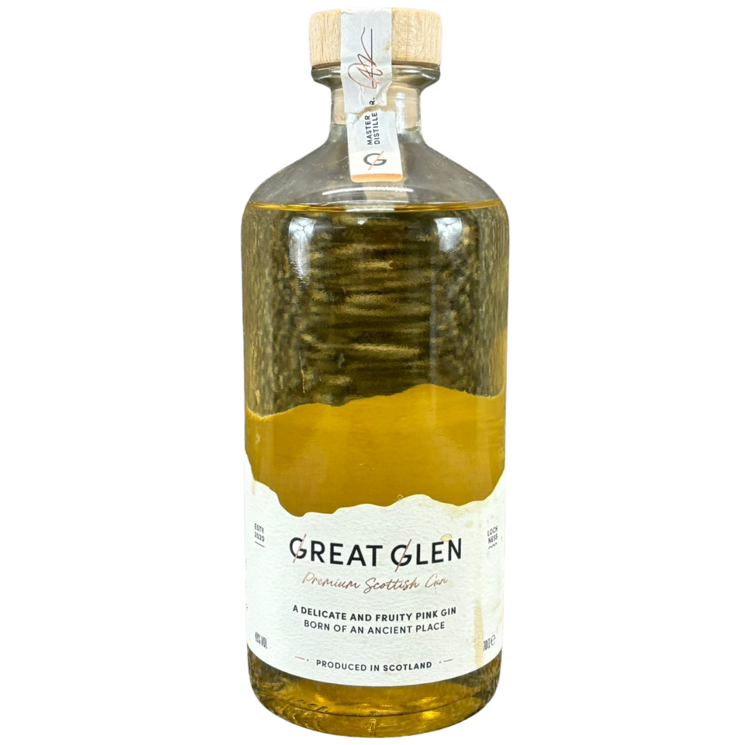 A 70cl bottle of Great Glen Premium Scottish Gin presents a clean, modern look with its rounded bottle, natural wooden stopper and textured label inspired by the rugged Highland landscape. The soft golden tint of the liquid adds a unique touch, giving it an instantly eye-catching appearance that stands out beautifully on any bar shelf or drinks cabinet.