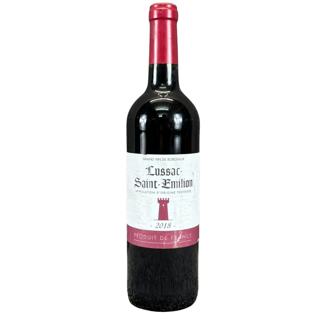 A 2018 bottle of Lussac Saint-Émilion Bordeaux Wine, shown exactly as in the image with its deep red capsule, classic Bordeaux bottle shape and clean, traditional label. The vintage, appellation and tower emblem all match perfectly, confirming this as an authentic Lussac Saint-Émilion from the celebrated Right Bank region of Bordeaux. The label shows slight surface wear, which is purely cosmetic and does not affect the wine itself.