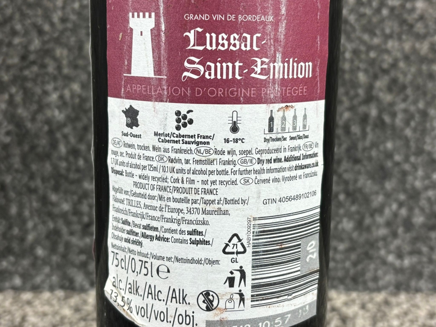 A 2018 bottle of Lussac Saint-Emilion Bordeaux Wine. 75cl.