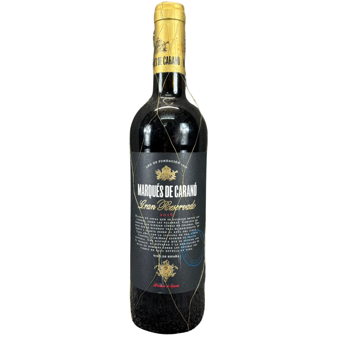 A 75cl bottle of Marqués de Caraño Red Wine from the 2016 vintage, shown exactly as in the image with its elegant black label, gold accents and traditional decorative wire netting. The bottle matches perfectly, including the vintage year and the distinctive crest, confirming this as an authentic Gran Reservado-style Spanish red known for its depth and richness.