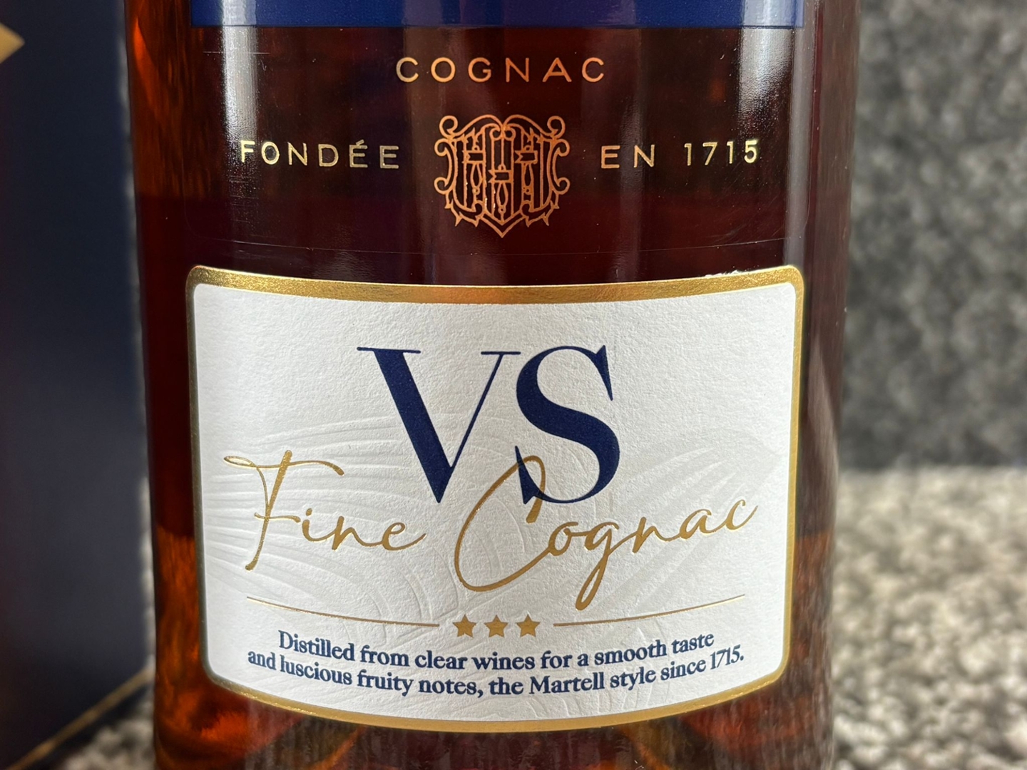 A bottle of Martell VS Fine Cognac in a presentation box. 70cl.
