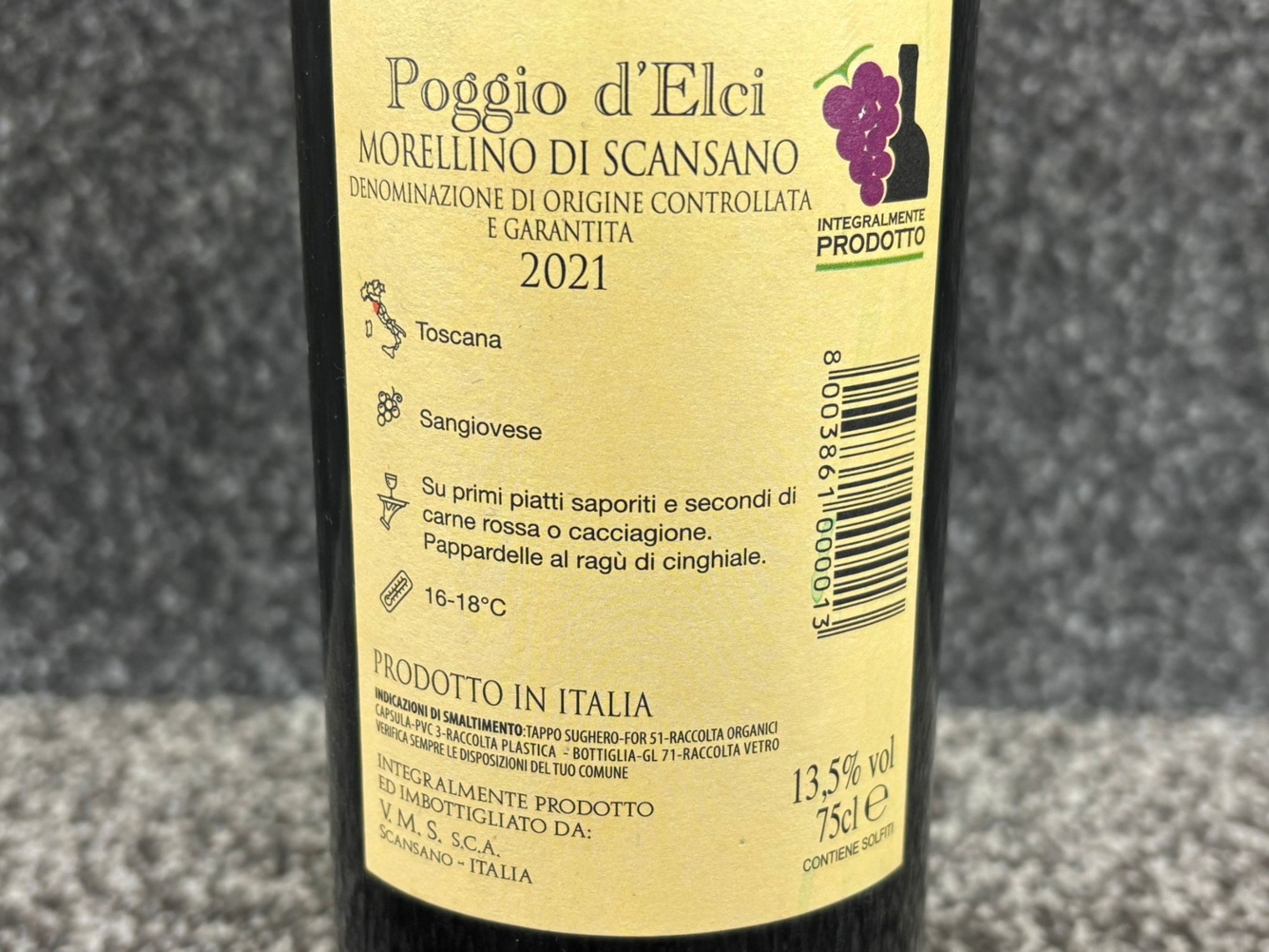 - > Bottle of Morellino Di Scansano Wine.
