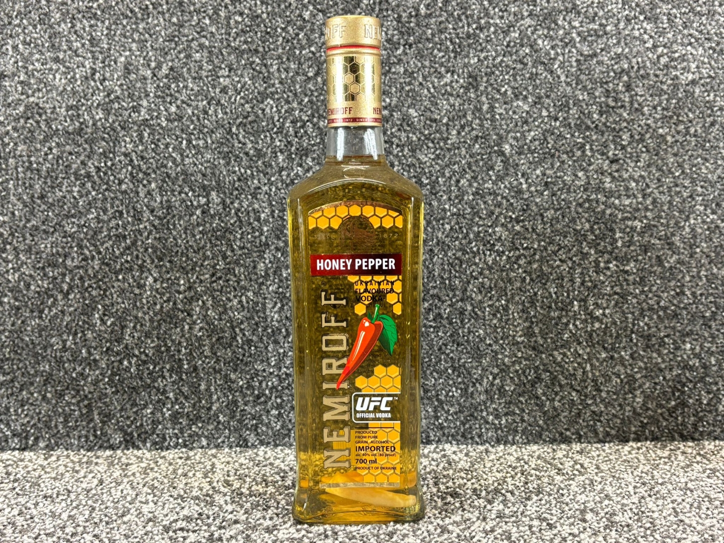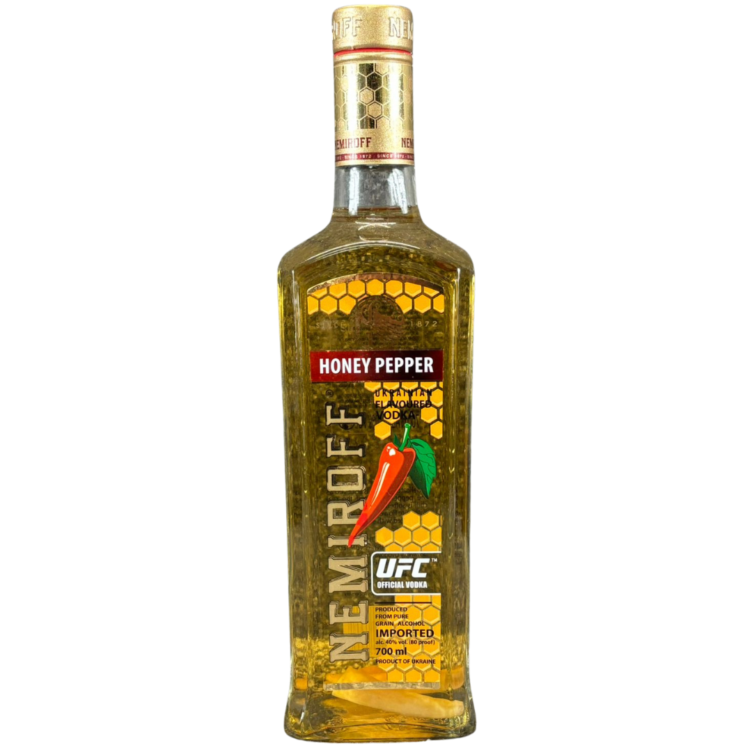 A 700ml bottle of Nemiroff Honey Pepper Ukrainian Flavoured Vodka brings together sweetness, spice and tradition in one striking presentation. The golden liquid reflects its unique infusion of natural honey and fiery red pepper, a combination deeply rooted in Ukrainian distilling heritage. The bold label design and hexagonal honeycomb pattern highlight its character, while the UFC Official Vodka branding adds a modern, energetic touch.