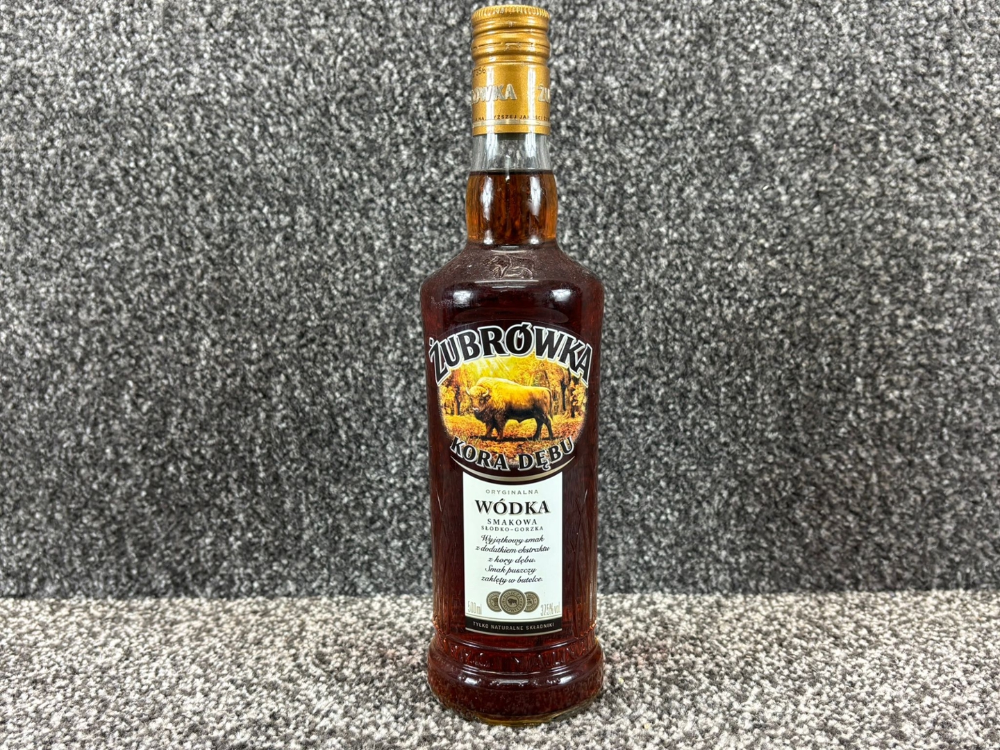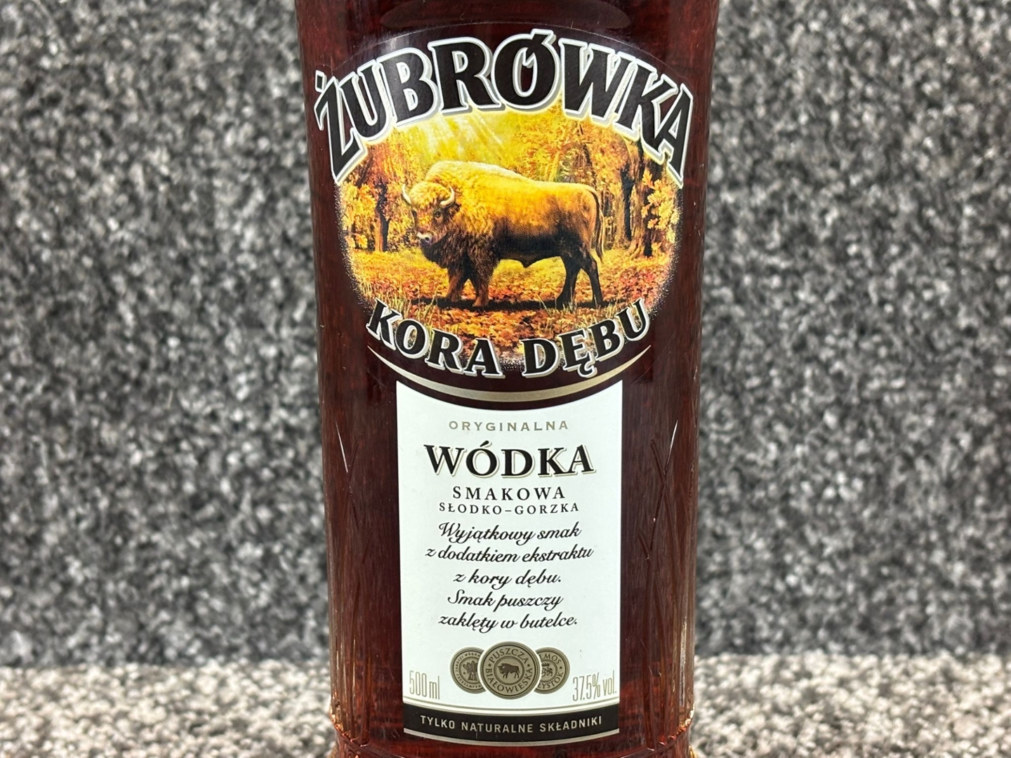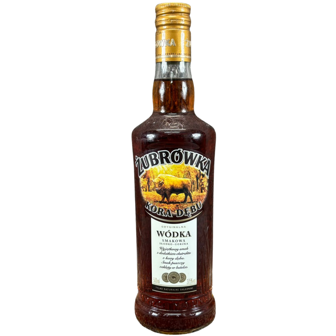 - > Bottle of Zubrowka Kora Debu Vodka.
