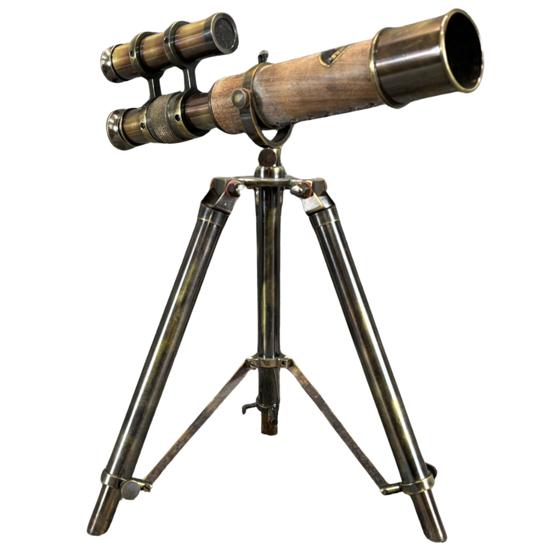 A brass telescope on a tripod stand captures the timeless charm of classic nautical and scientific instruments. Beautifully crafted with a warm antique brass finish, it evokes the spirit of exploration and discovery. The telescope features fine detailing along its barrel and eyepiece, giving it an authentic vintage appeal that’s both decorative and functional in design.