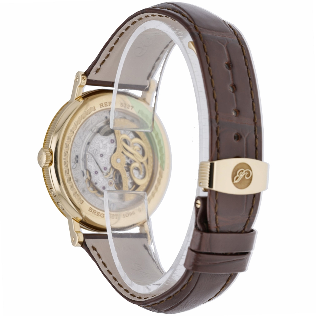 A Breguet Classique reference 5327, crafted in 18ct rose gold and paired with a brown leather strap, showcases one of the most refined perpetual calendar displays in modern haute horlogerie. The 39mm case houses a beautifully executed silver guilloché dial, featuring traditional engine-turned patterns, blued Breguet hands, and applied Roman numerals. Multiple sub-dials display the day, date, month, leap year, and moonphase, all arranged in Breguet’s signature balanced and highly legible layout.