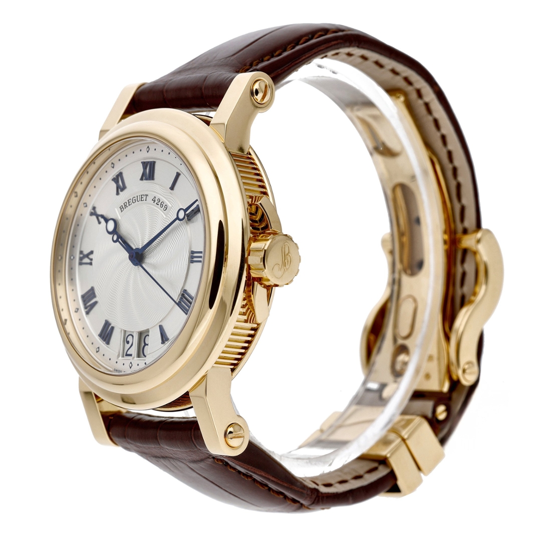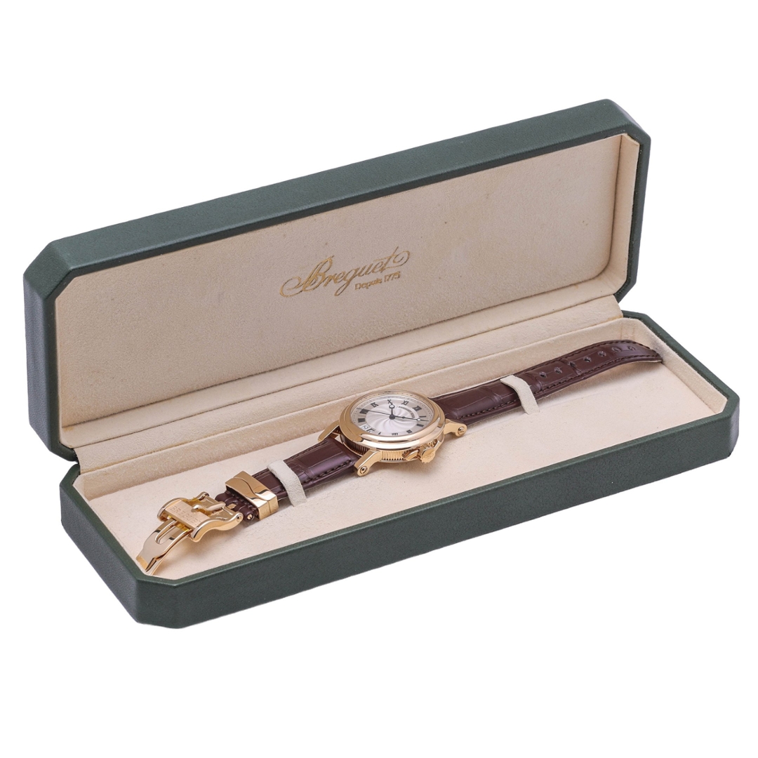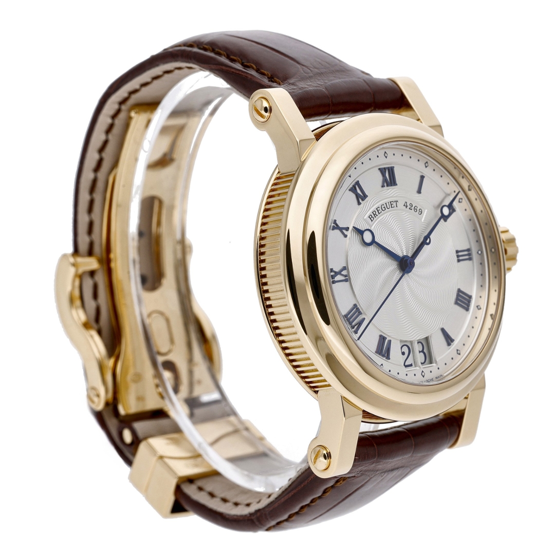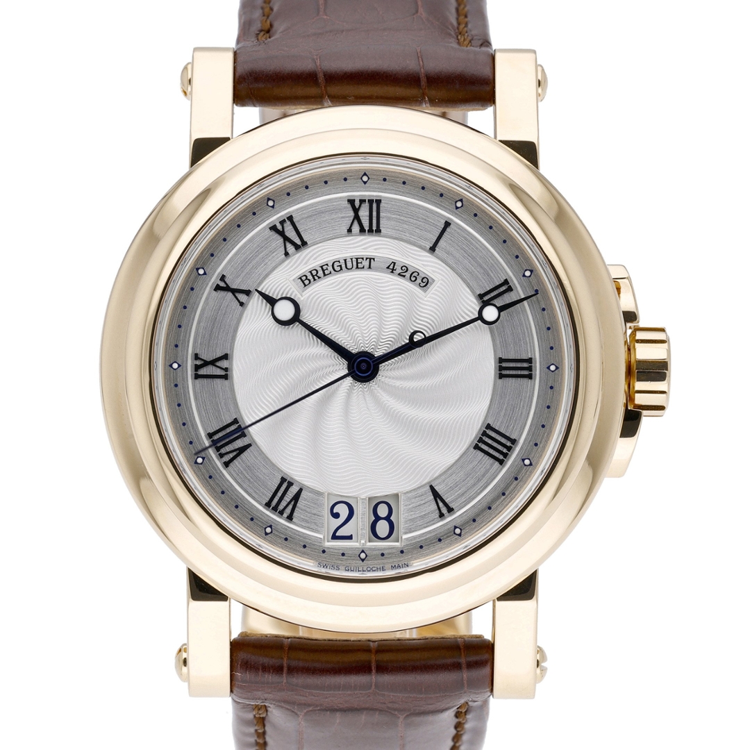 A Breguet Marine Watch, Brown Leather Strap with an 18ct Rose Gold Case & Clasp on a Silver Dial