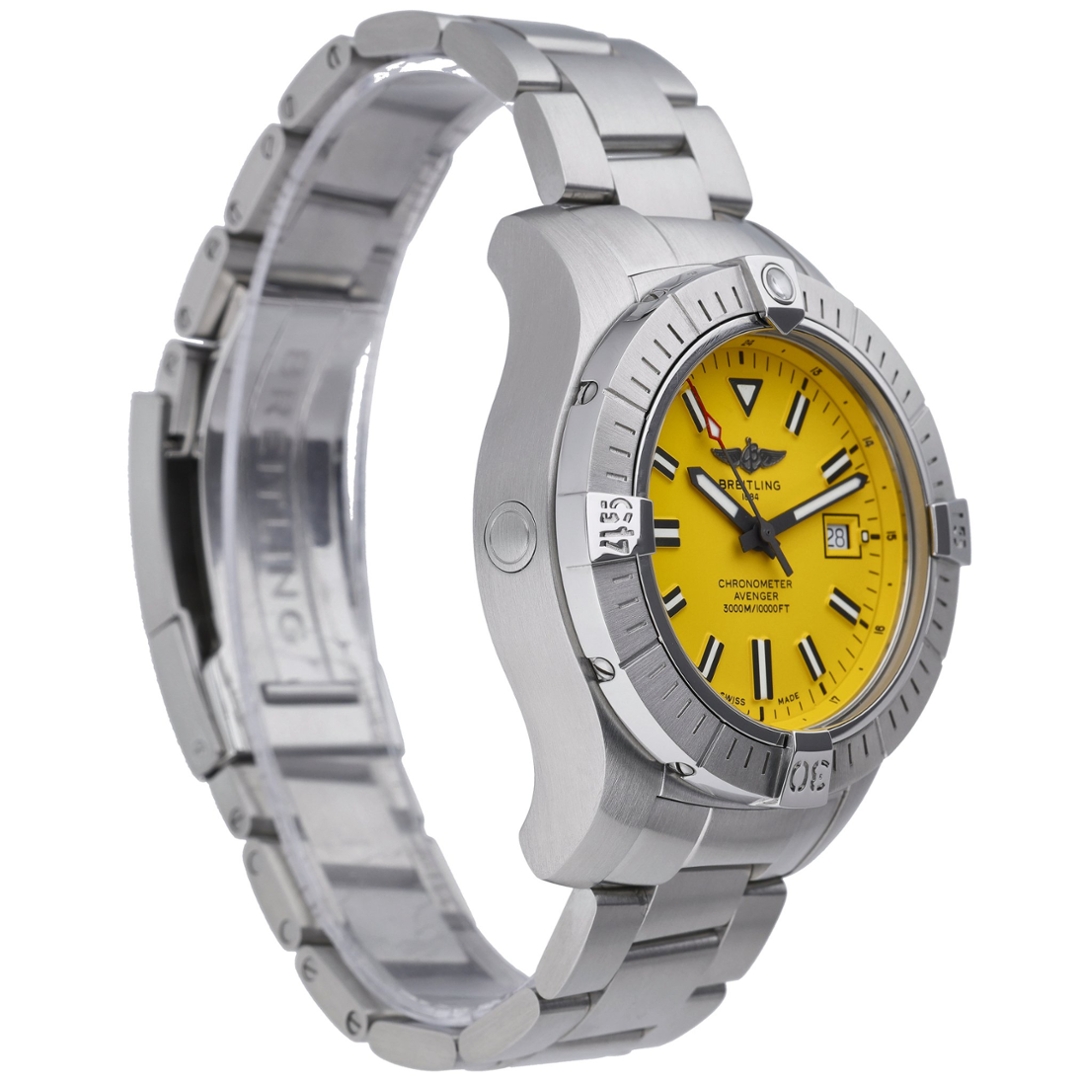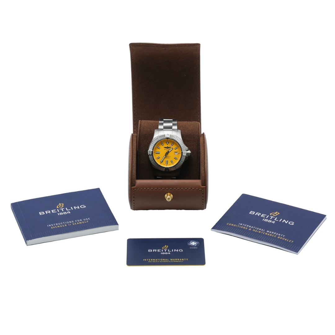 A Breitling Avenger II Seawolf watch, crafted entirely from stainless steel and featuring a bold yellow dial that epitomises the model’s rugged and adventurous spirit. Model number A17319: this 2022 example is purpose-built for extreme conditions, offering professional-grade performance in a striking, instantly recognisable design.