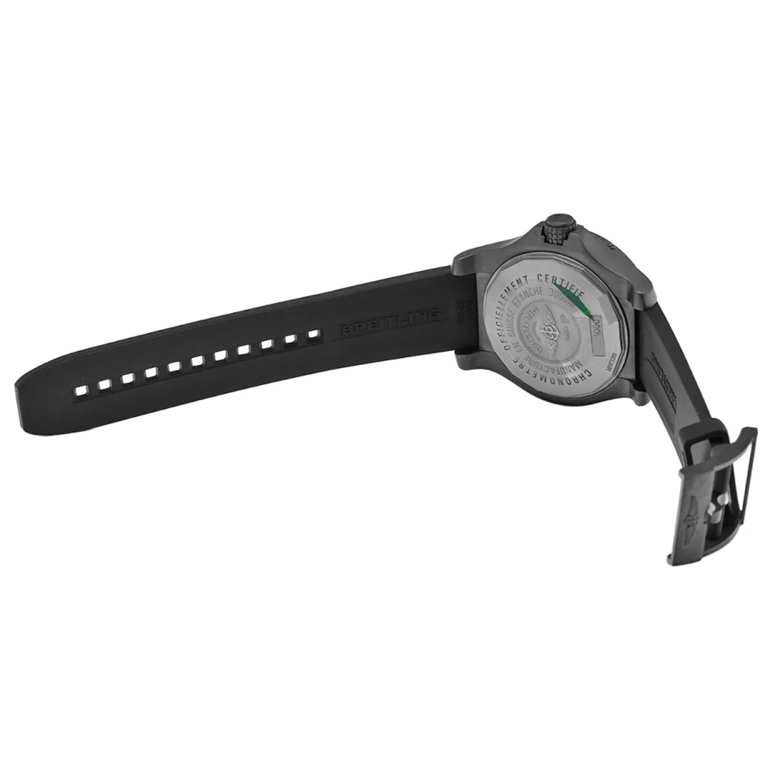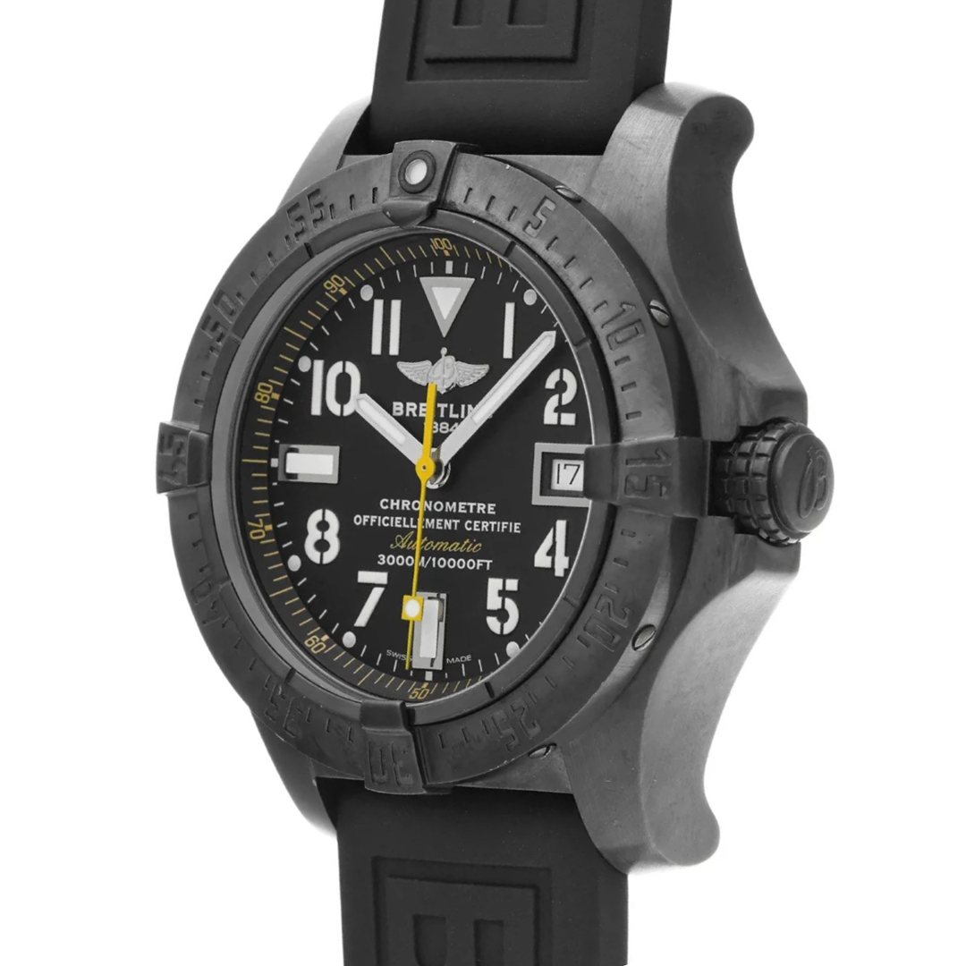 A Breitling Avenger Seawolf M17330B2/BC05 is a serious professional dive watch, engineered for extreme performance. The imposing 45mm Blacksteel case is paired with a matching unidirectional bezel and bold black dial, accented by oversized Arabic numerals and a striking yellow seconds hand for maximum legibility. Fitted with a robust black rubber strap and a Blacksteel clasp, it delivers a stealth aesthetic with genuine tool-watch credibility.
