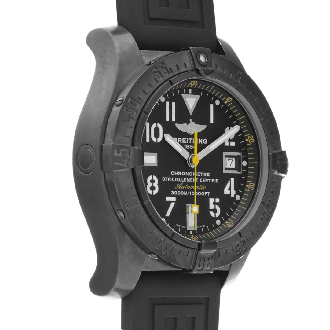 Powered by the Breitling Calibre 17 automatic movement, this model is COSC-certified as a chronometer, ensuring impressive precision and reliability. Built for saturation-level depths, it boasts an exceptional 3,000 metres of water resistance, underlining its Seawolf designation. The screw-down crown and reinforced case construction make it a true instrument watch designed for demanding conditions.