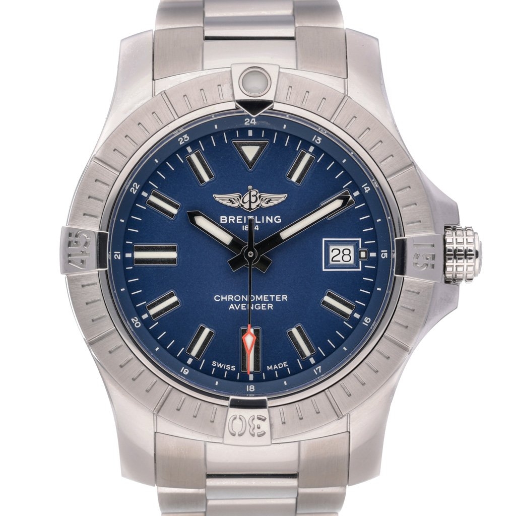 A Breitling Avenger Watch, model A17318, presented in immaculate condition. This striking 2022 model features a 43mm stainless steel case, matching strap and clasp, and a bold blue dial that captures the spirit of aviation and adventure. Powered by a precise automatic movement and backed by its original Breitling paperwork, it also includes a 12-month WLC warranty and is fully boxed and certified.