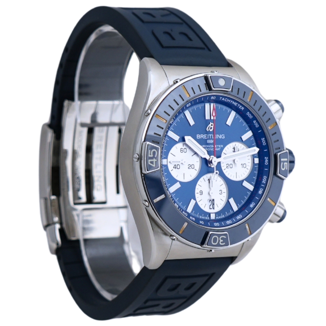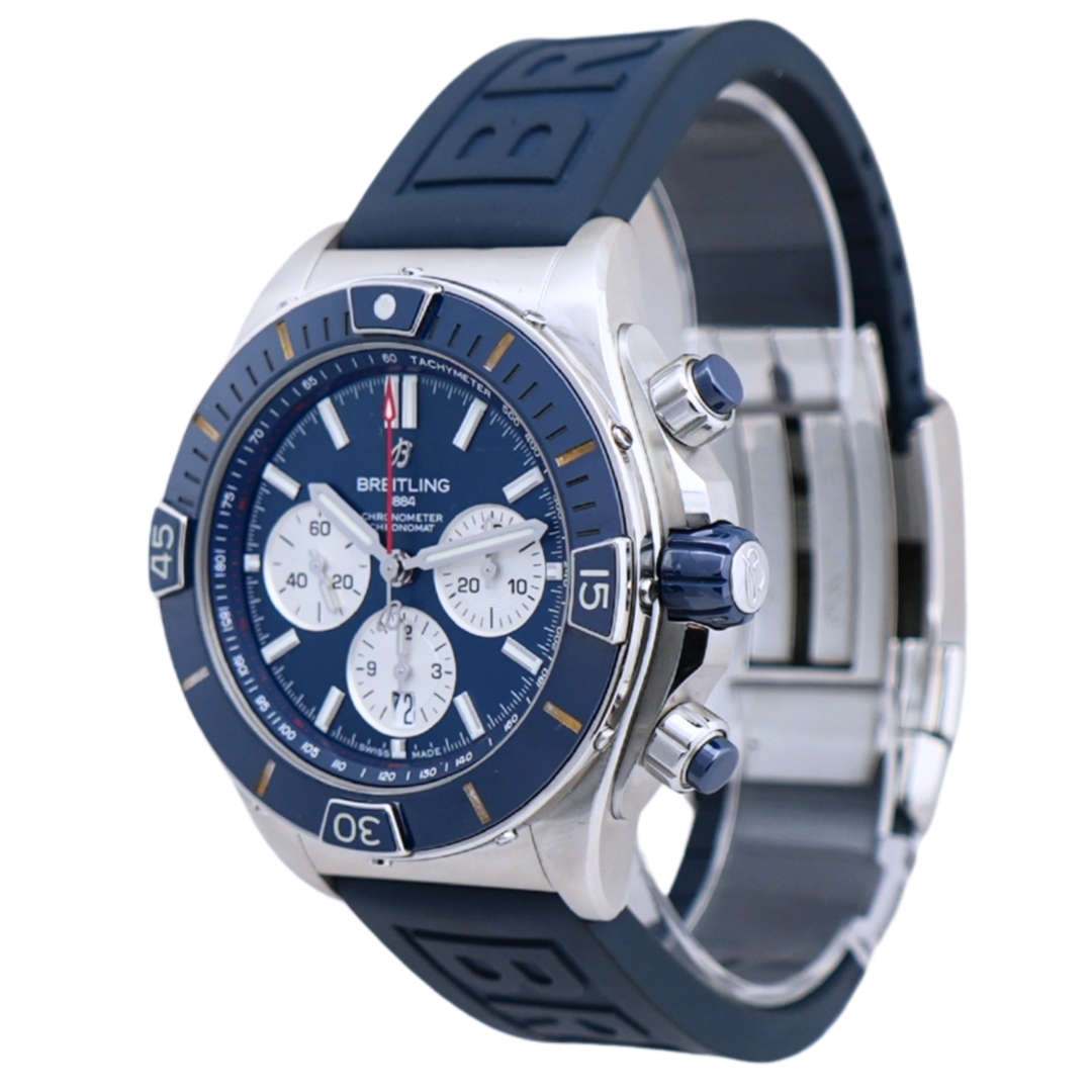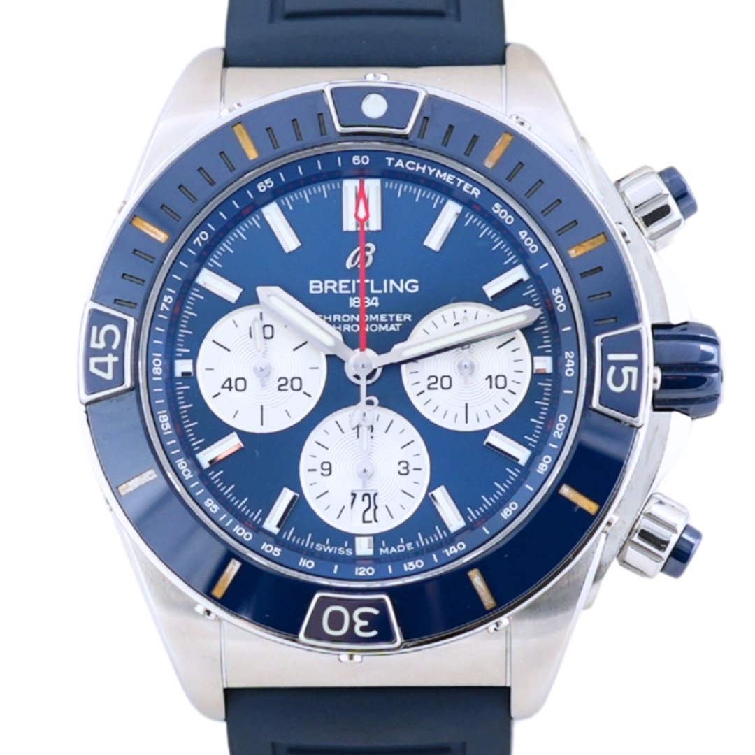 A Breitling Chronomat AB0136 presents a bold, modern sports chronograph in a 44mm stainless steel case, paired with a deep blue dial and matching blue bezel. The applied hour markers, contrasting sub-dials and red central chronograph seconds hand deliver strong legibility, while the unidirectional bezel reinforces its professional tool-watch character.