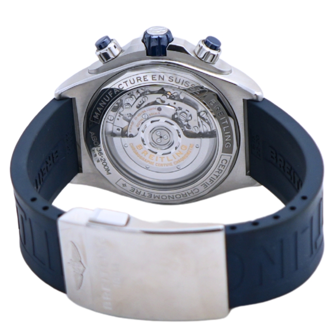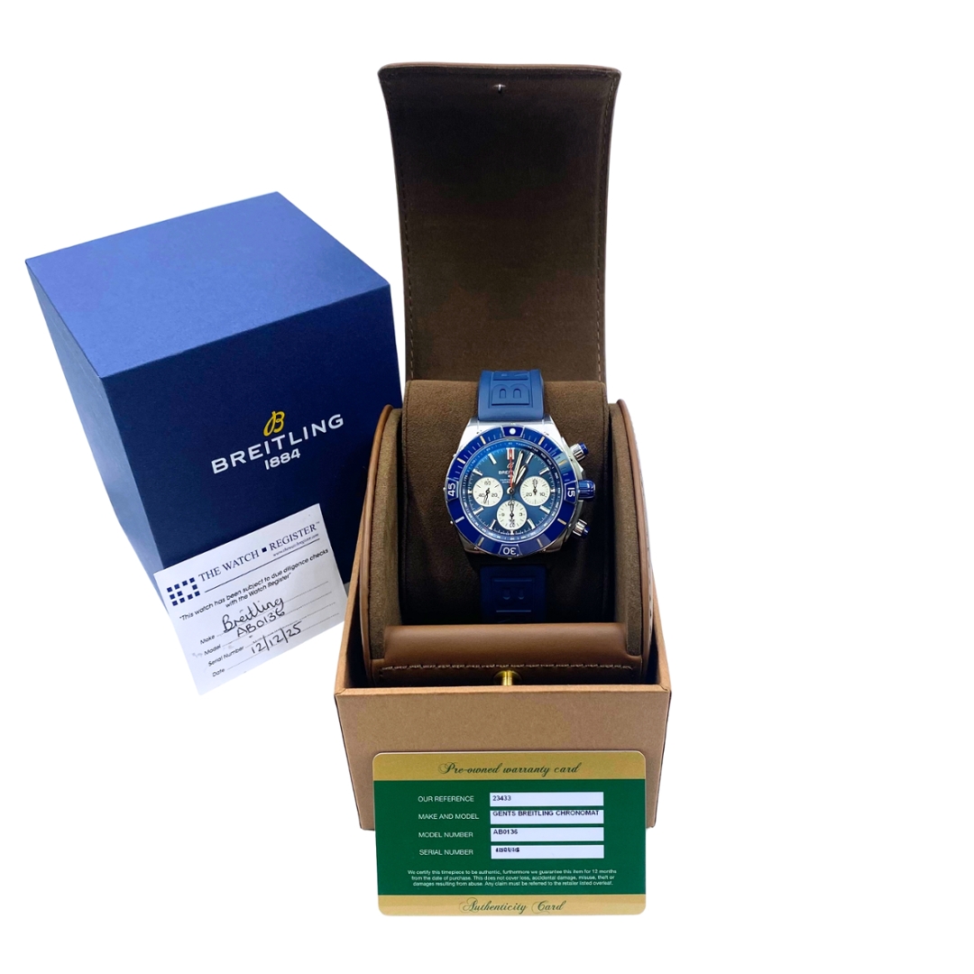Fitted to a blue rubber strap with a stainless steel clasp, this Chronomat wears securely and comfortably, balancing sportiness with refinement. Offered in good condition, it is boxed and certified, and includes a 12-month WLC warranty, making it a substantial, confidence-inspiring addition to any modern collection.