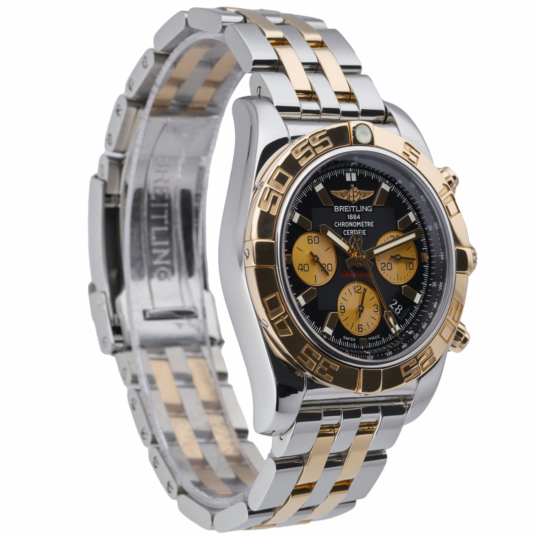 This Breitling Chronomat CB011012/B968 is presented in a substantial 44mm case crafted from stainless steel with an 18ct rose gold rider-tab bezel, paired with the iconic Rouleaux bracelet in matching bi-metal construction. The black dial is complemented by contrasting gold chronograph subdials, applied baton hour markers, and a discreet date aperture at four-thirty, creating a bold, unmistakably Chronomat aesthetic.