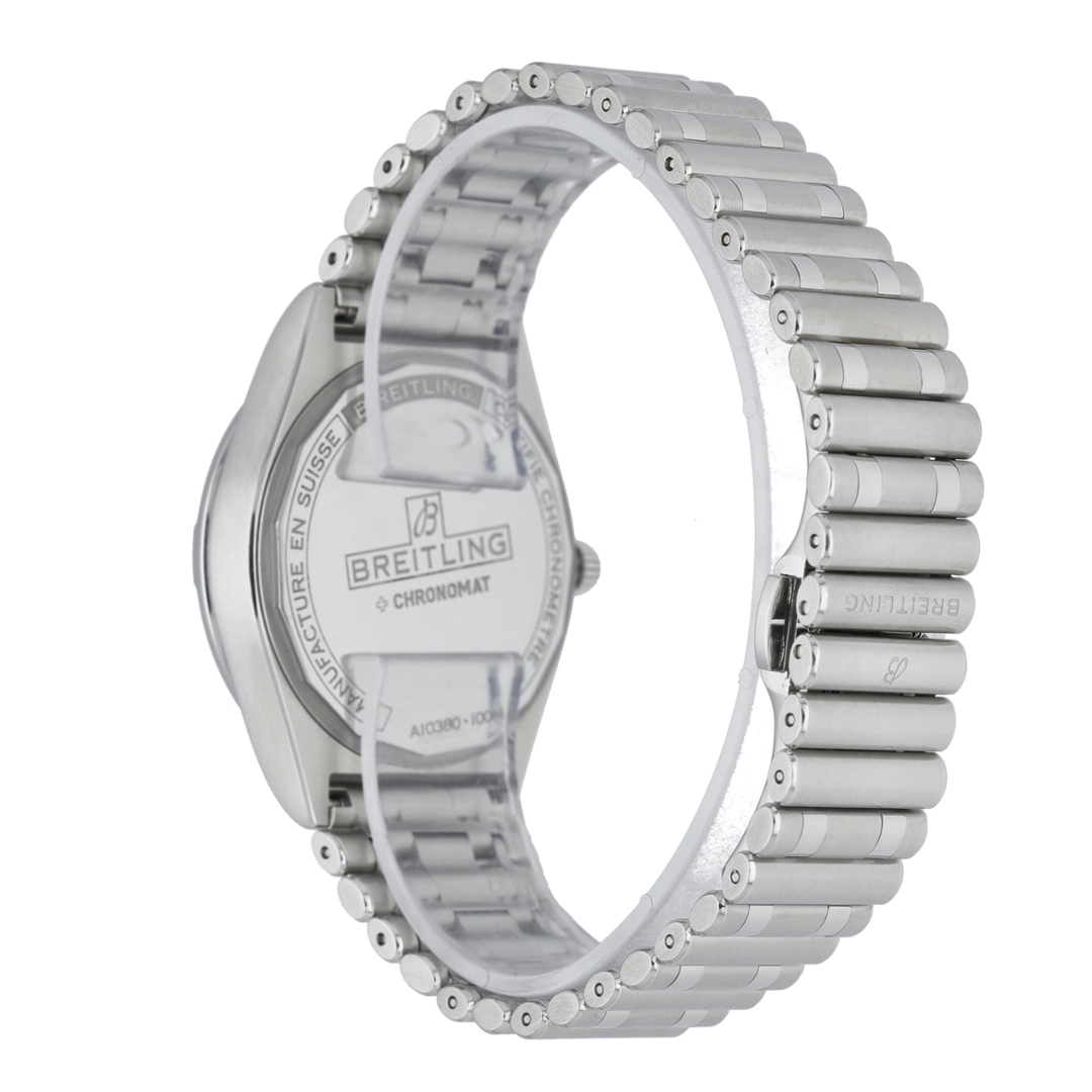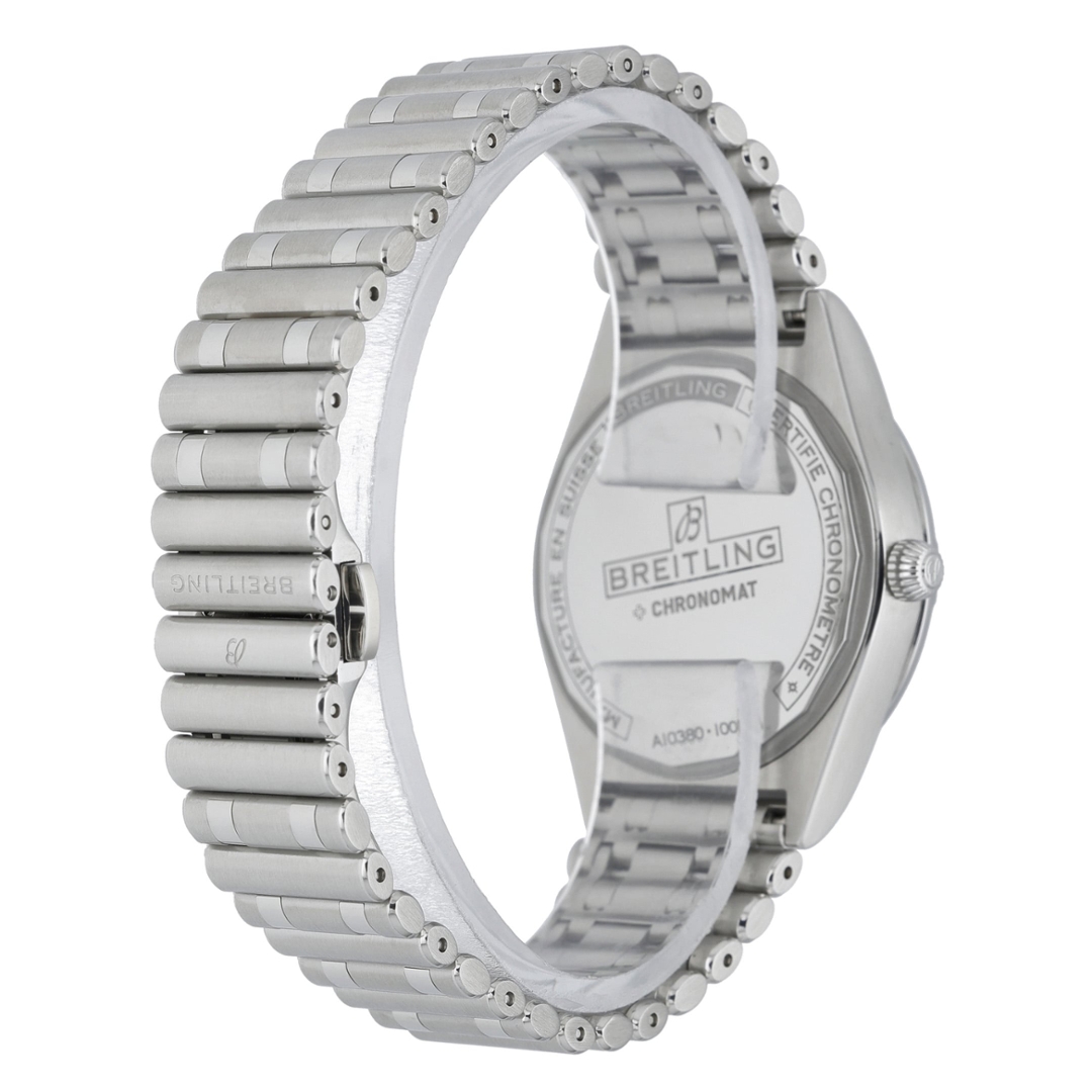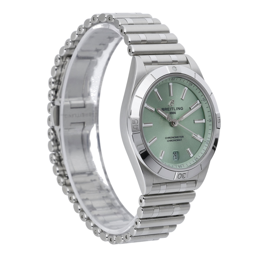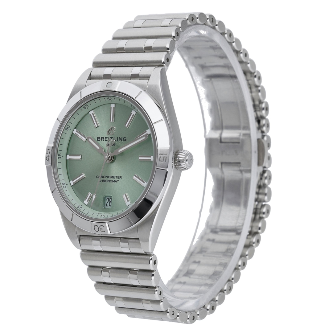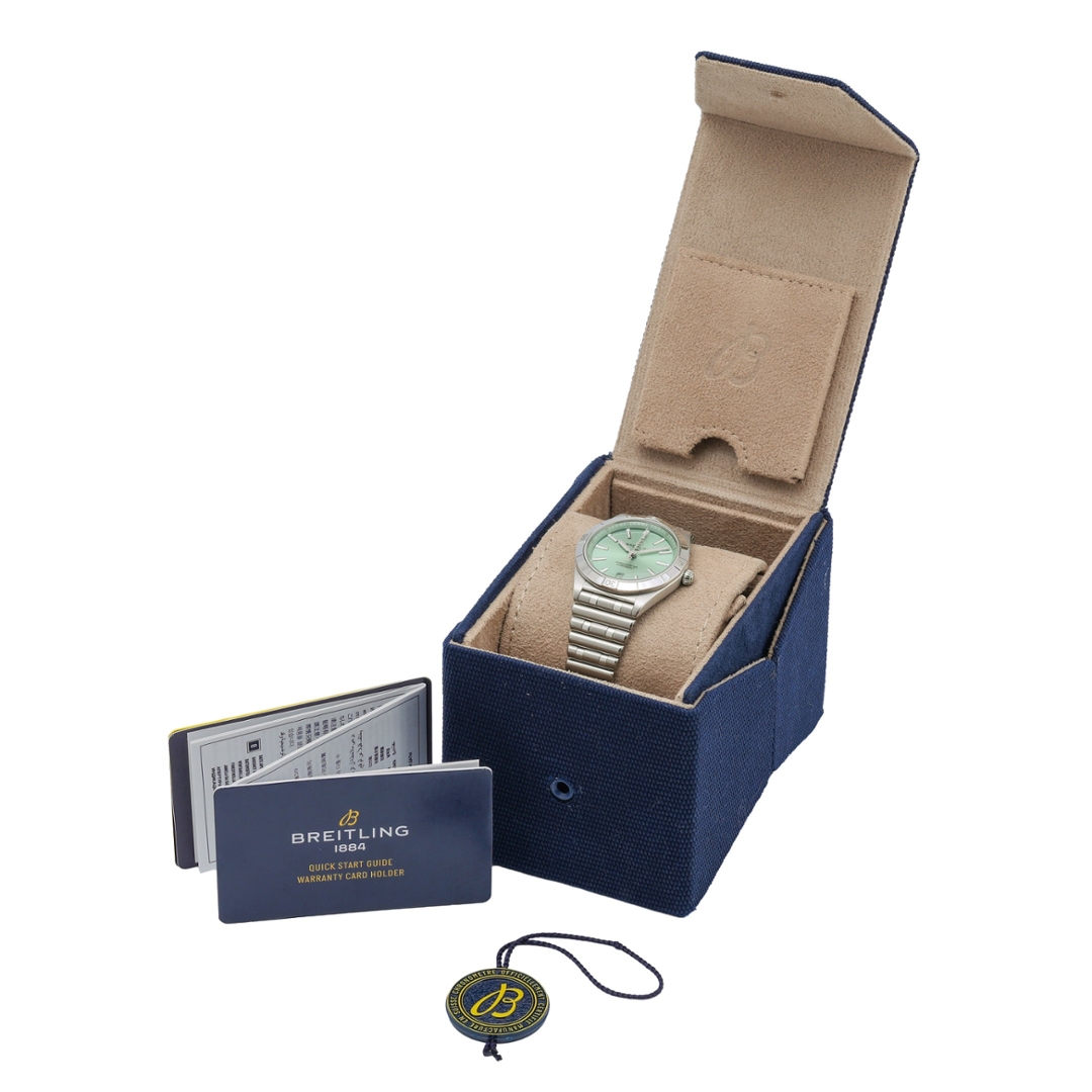The 36mm stainless steel case is paired with Breitling’s signature rider-tab bezel, offering both visual distinction and practical functionality. The striking green dial features applied baton hour markers and luminous hands for excellent legibility, while the date aperture is positioned neatly at 6 o’clock for a balanced display. The dial is also marked “Chronometer”, confirming the watch’s COSC-certified automatic movement, ensuring exceptional accuracy and reliability. Clean dial proportions and polished indices give the watch a refined yet sporty appearance.