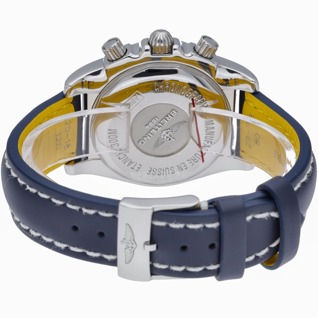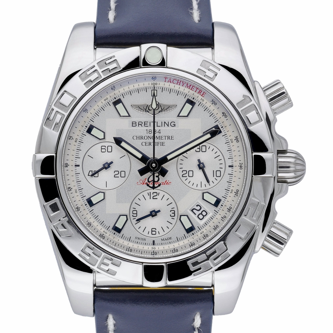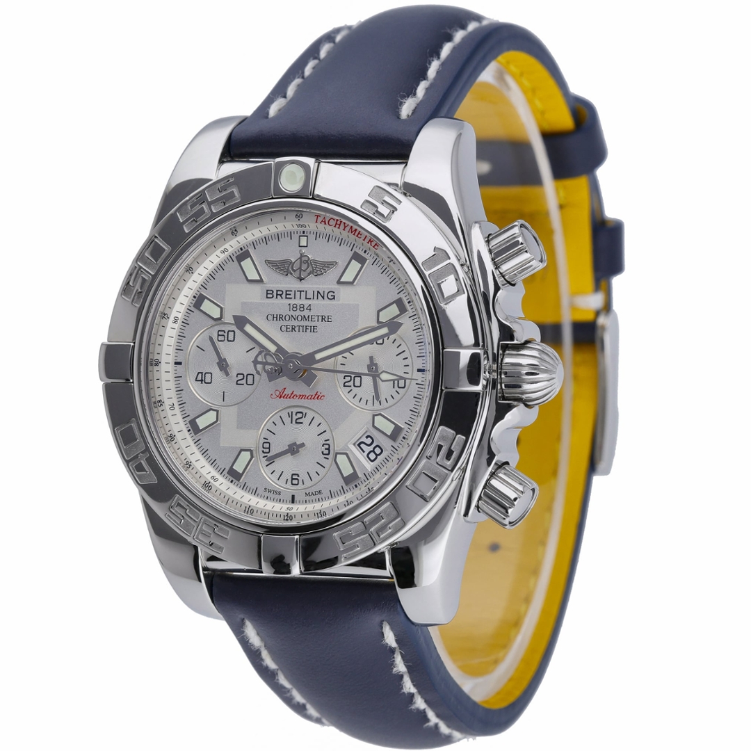 A Breitling Chronomat, model AB0140, presented in stainless steel with a blue leather strap, offering a bold and highly recognisable design rooted in the brand’s aviation heritage. The 41mm case is paired with the signature rider-tab bezel, giving the watch its distinctive and robust character. The crisp white dial is accented with applied hour markers, contrasting sub-dials, and a red chronograph seconds hand, delivering both clarity and visual impact, alongside a date display positioned between 4 and 5 o’clock.