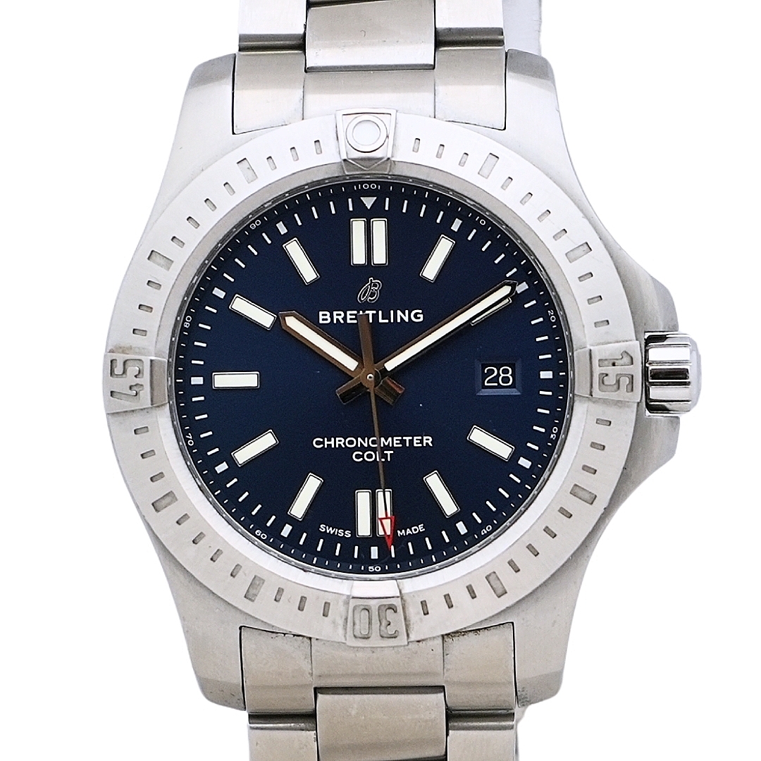 A Breitling Colt Automatic 44, reference A17388101C1A1, embodies the bold spirit and technical precision that define the Breitling legacy. Crafted entirely from stainless steel, this robust 44mm model exudes strength and presence, complemented by a striking blue dial that captures the light with remarkable depth. The dial features luminous hour markers, a date window at 3 o’clock, and Breitling’s signature winged logo — a design that perfectly balances sporty character with refined craftsmanship.