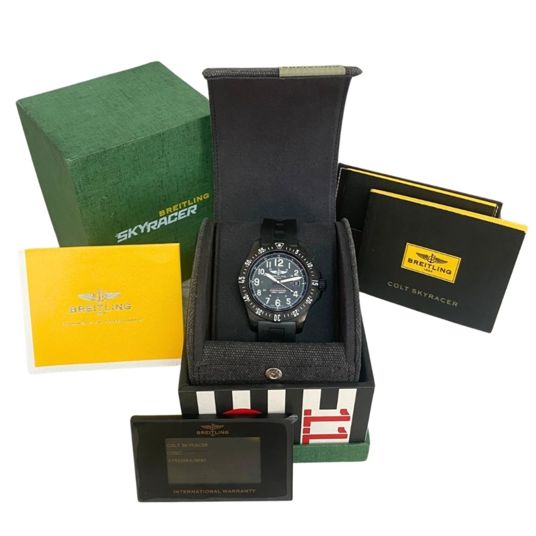 A Breitling Colt Skyracer, model X74320E4/BF87, is a rugged, stylish timepiece designed for those who value precision and performance in an aviation-inspired design. Released in 2018, this watch features a robust 45mm carbon case that is lightweight yet durable, making it practical and comfortable for everyday wear. The black rubber strap is not only comfortable but also enhances the watch's sporty aesthetic, offering a perfect blend of performance and style.