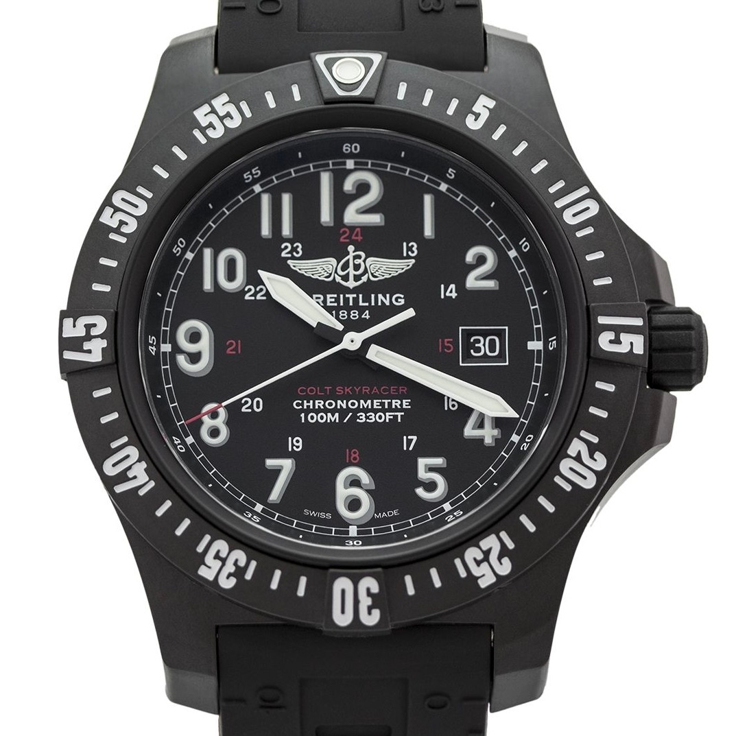 The black bezel and dial create a bold, monochromatic look, with clean, legible markings and luminescent hands ensuring readability even in low-light conditions. The Colt Skyracer is powered by Breitling's automatic movement, offering reliable timekeeping and a power reserve that suits its wearer's dynamic lifestyle. The carbon case is a standout feature, offering a modern, innovative approach to watchmaking that sets it apart from traditional stainless steel models.