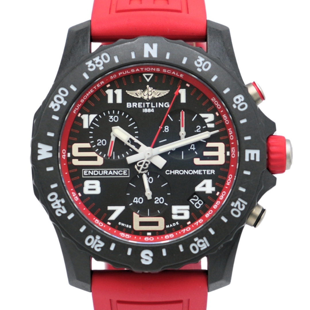 A Breitling Endurance Pro X82310 is a dynamic, high-performance sports watch that combines precision with striking design. This watch is lightweight and durable, featuring a 44mm carbon case that offers exceptional impact and wear resistance. The sleek black bezel and dial provide a bold, tactical look, while the red rubber strap adds a vibrant touch, ensuring comfort and flexibility for all-day wear.