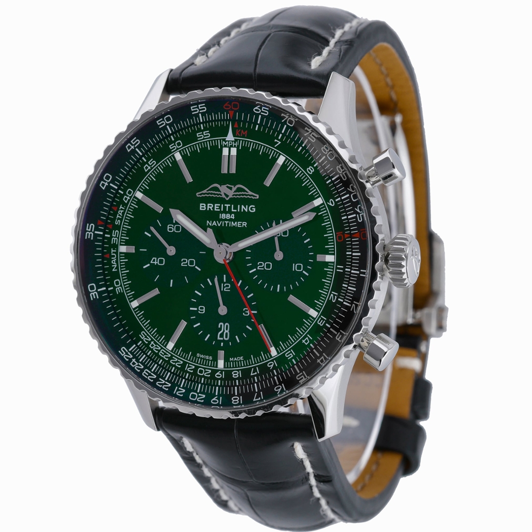 The dial is configured in a classic tri-compax layout, featuring chronograph registers at 3, 6, and 9 o’clock, complemented by a date aperture positioned at 6. The intricate slide rule allows for a range of calculations, a signature feature of the Navitimer since its inception. Baton hour markers and luminous hands ensure clarity, while the red chronograph seconds hand adds a sharp, functional accent against the rich green backdrop.