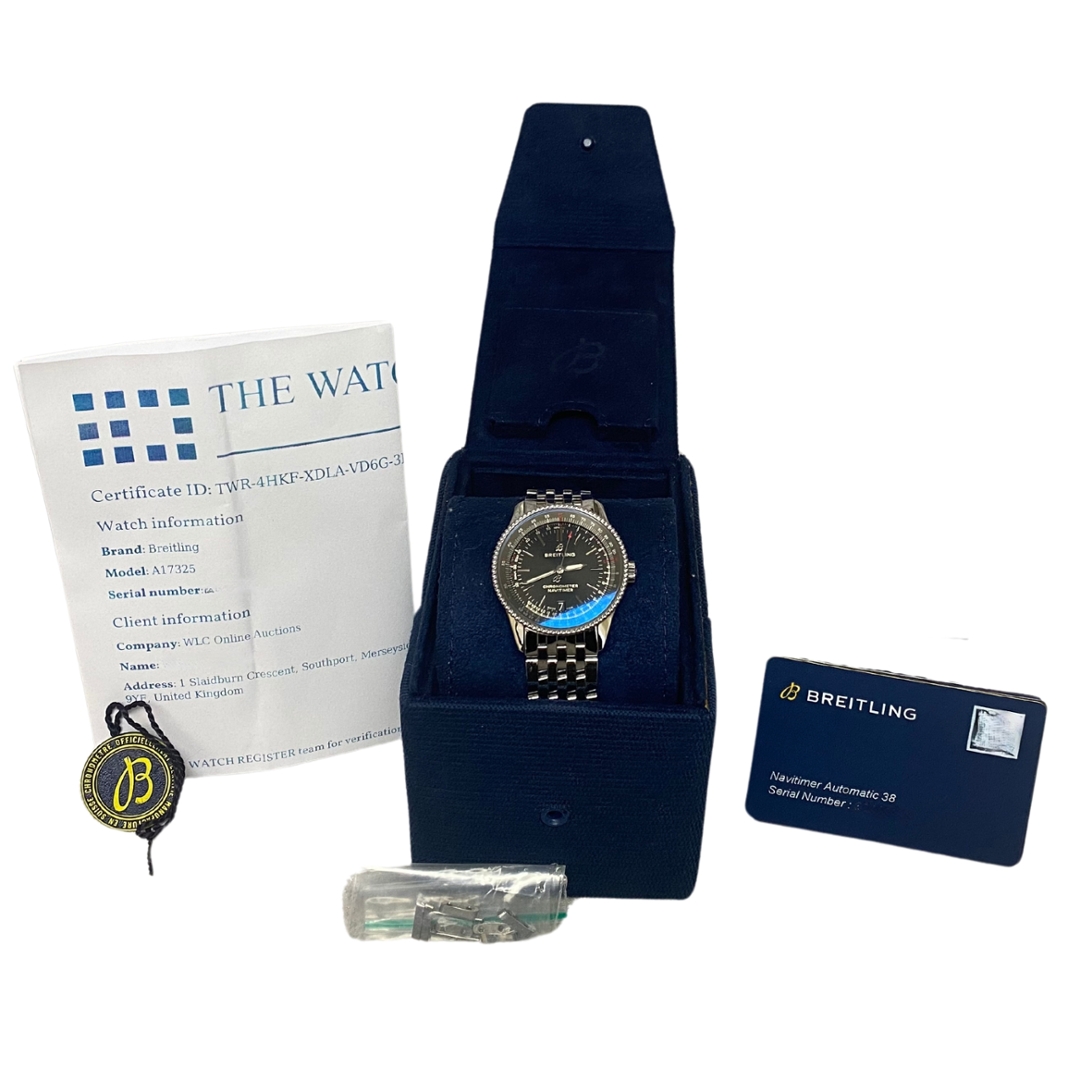 A Breitling Navitimer, model A17325, is a refined and iconic timepiece that embodies the heritage and innovation for which Breitling is renowned. Crafted from stainless steel, its 38mm case strikes a perfect balance between contemporary elegance and classic appeal. With its clean and functional design, the striking black dial is complemented by subtle details that highlight the Navitimer's aviation-inspired legacy.