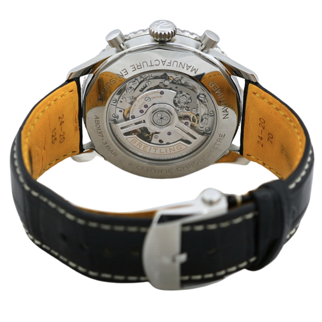 Powering this watch is the Breitling Calibre B01 automatic movement, an in-house chronograph calibre celebrated for its precision, durability, and impressive 70-hour power reserve. COSC-certified, the Calibre B01 ensures exceptional accuracy and reliability, while its column-wheel construction and vertical clutch enhance chronograph performance. This movement represents Breitling’s technical excellence and commitment to high horology, making the Navitimer AB0137 not just a tool watch, but also a refined mechanical achievement.