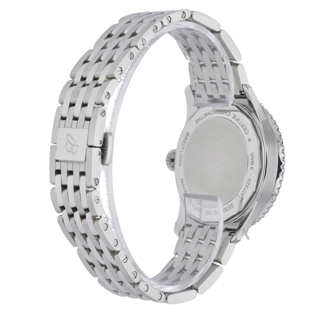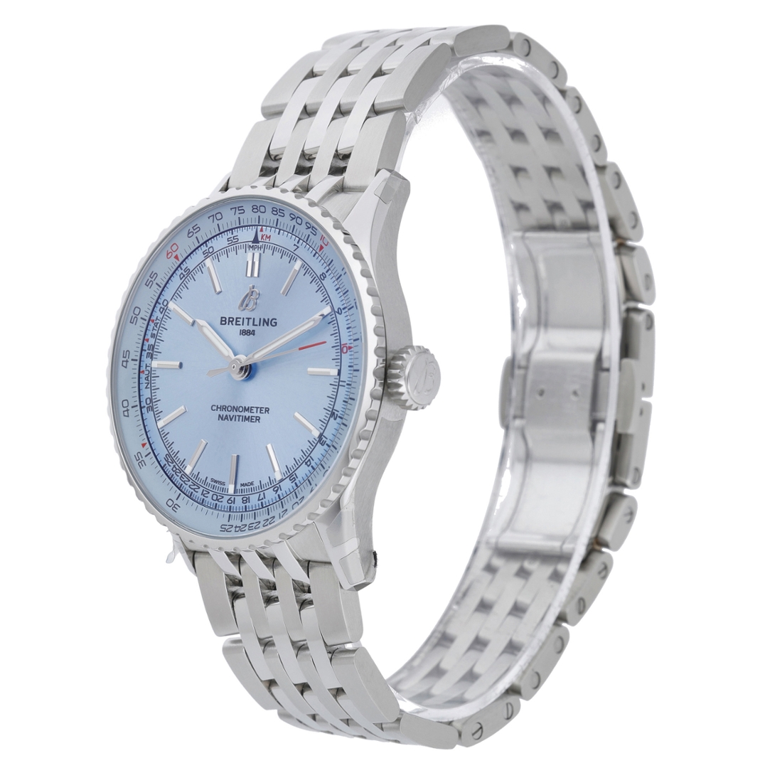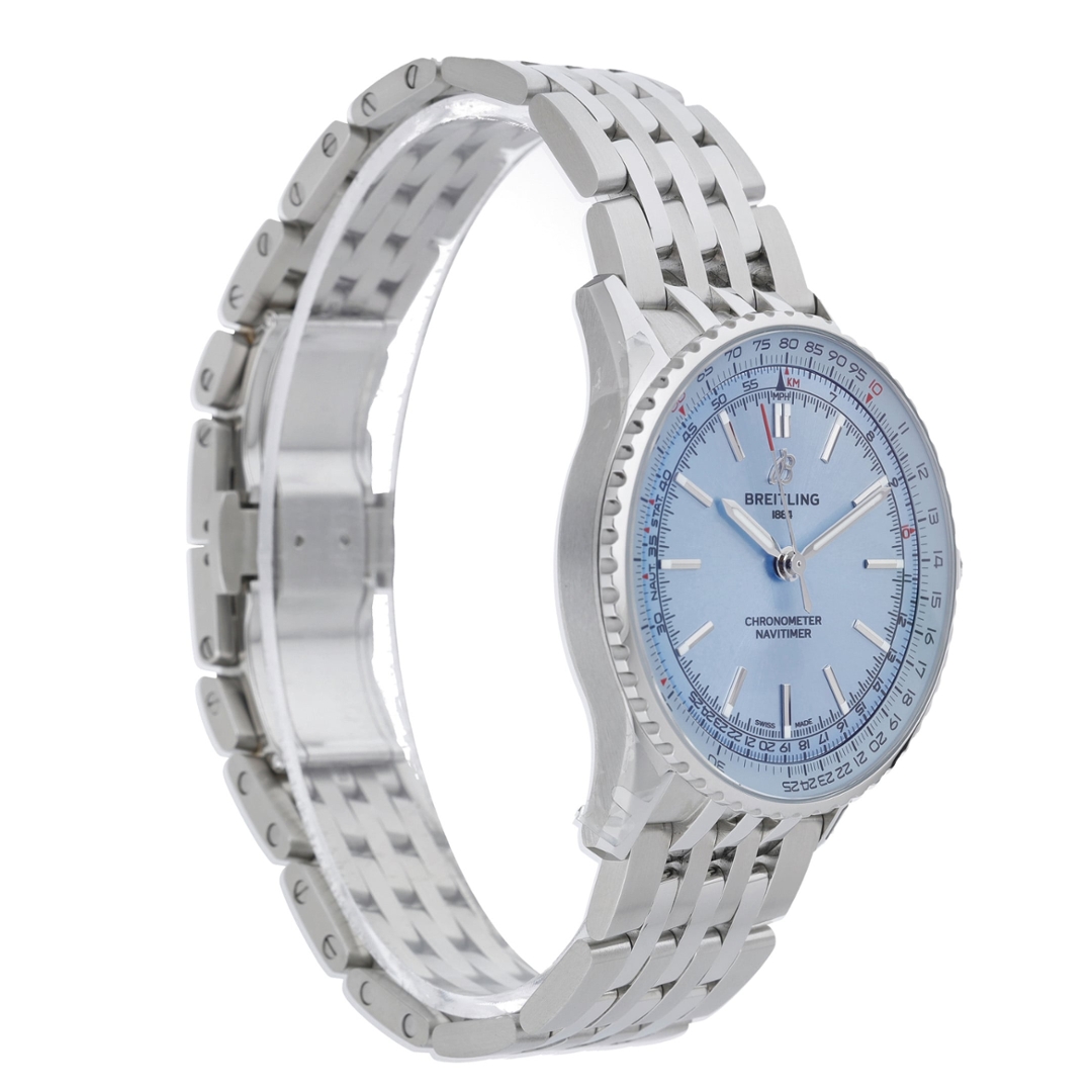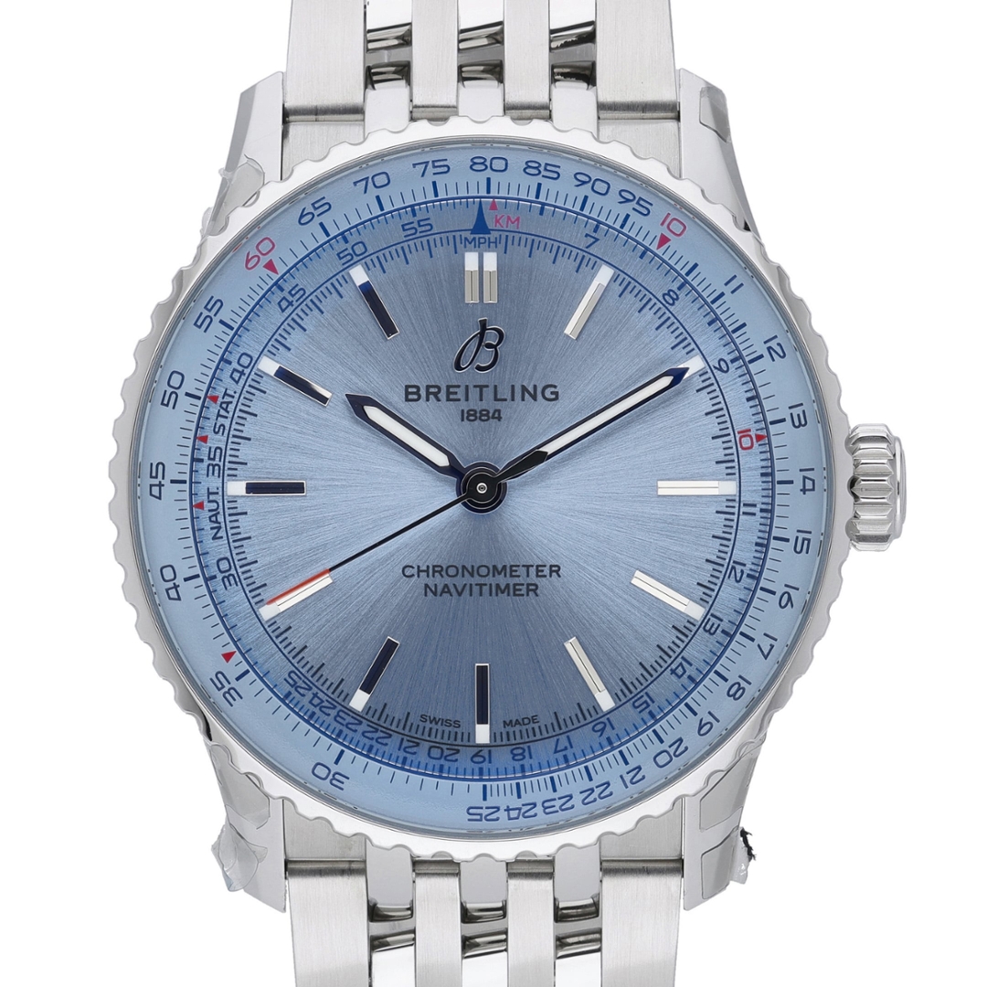 The 41mm stainless steel case frames a striking blue sunburst dial, delivering a refined yet technical appearance. Surrounding the dial is the Navitimer’s signature slide rule scale, allowing calculations such as fuel consumption, airspeed, and distance. Applied baton hour markers and luminous hands ensure strong legibility, while the dial is marked “Chronometer Navitimer,” confirming the presence of a COSC-certified automatic movement for exceptional precision and reliability. A discreet three-hand layout maintains a clean and balanced aesthetic.