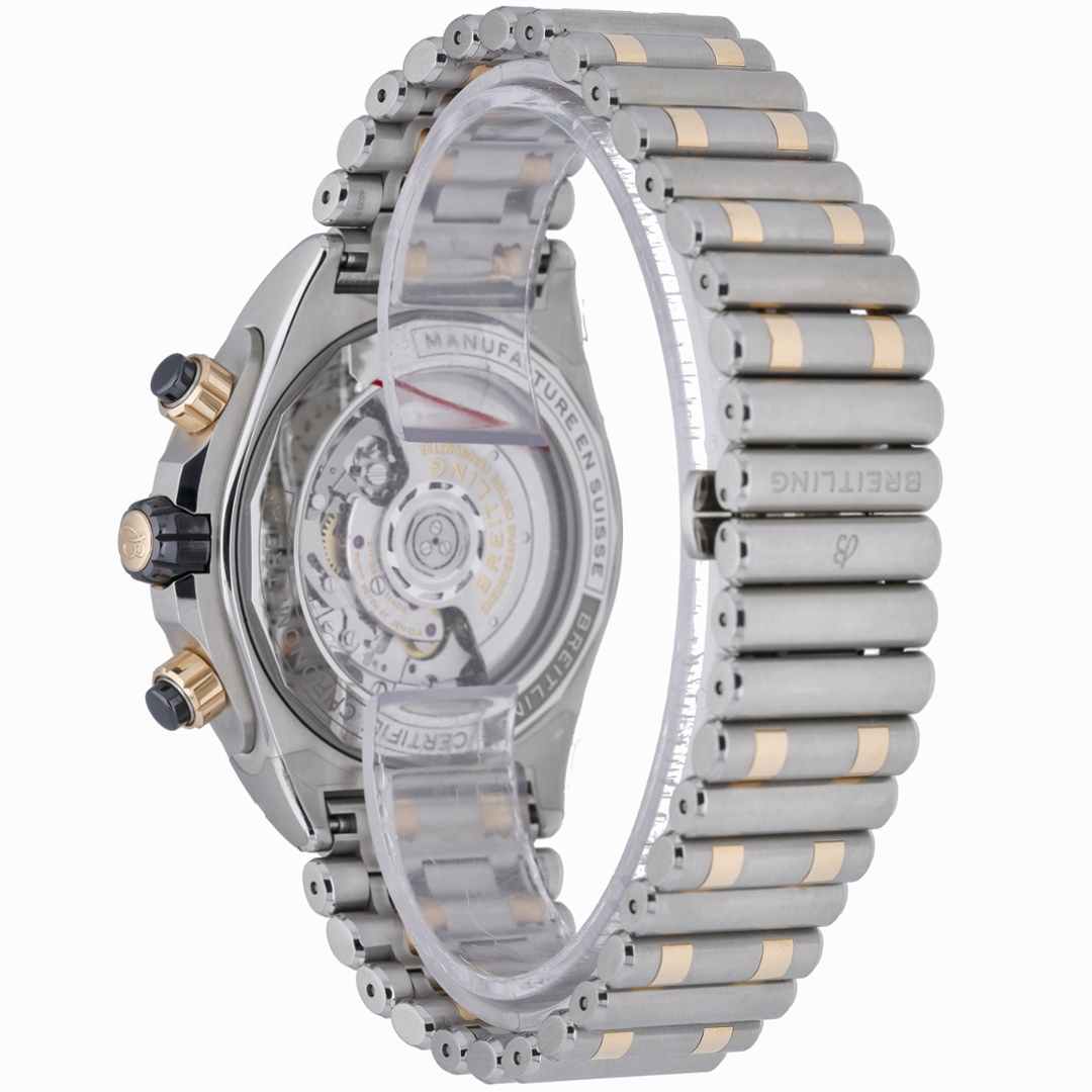 A Breitling Super Chronomat Watch, Stainless Steel & Rose Gold with a Black Bezel & Dial.