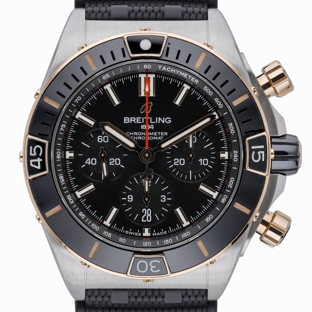 A Breitling Super Chronomat UB0136 in stainless steel and rose gold, featuring a bold black ceramic bezel and matching black dial. The substantial 44mm case delivers commanding wrist presence, enhanced by the rider tabs and contrasting rose gold accents that define the Super Chronomat line. The dial is fitted with luminous baton hour markers, three chronograph sub-dials and a date display at 6 o’clock, combining legibility with strong visual impact.