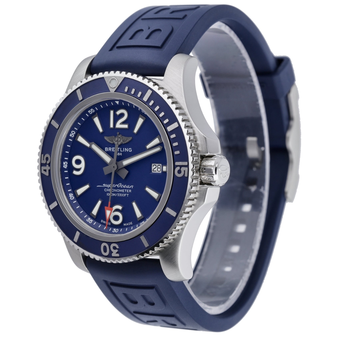 A Breitling Superocean 44 is a bold, competent professional dive watch designed for serious performance both in and out of the water. The substantial 44mm stainless steel case is paired with a striking blue unidirectional bezel and matching blue dial, delivering excellent legibility through oversized Arabic numerals, broad luminous hands, and a clearly defined minute scale. A discreet date window at three o’clock adds everyday practicality.